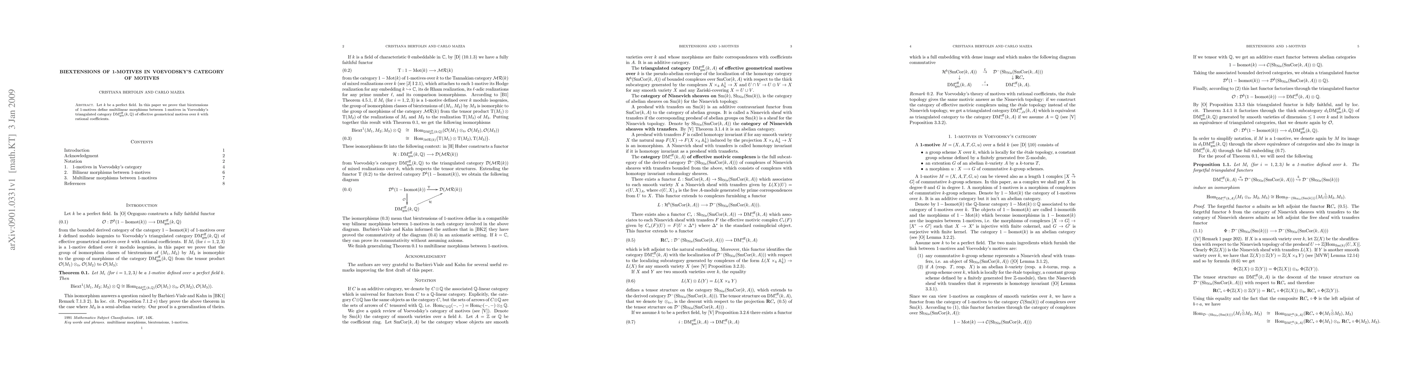 Summary: The paper establishes that biextensions of 1-motives correspond to multilinear morphisms between them within Voevodsky's category of effective geometrical motives over a perfect field with rational coefficients.