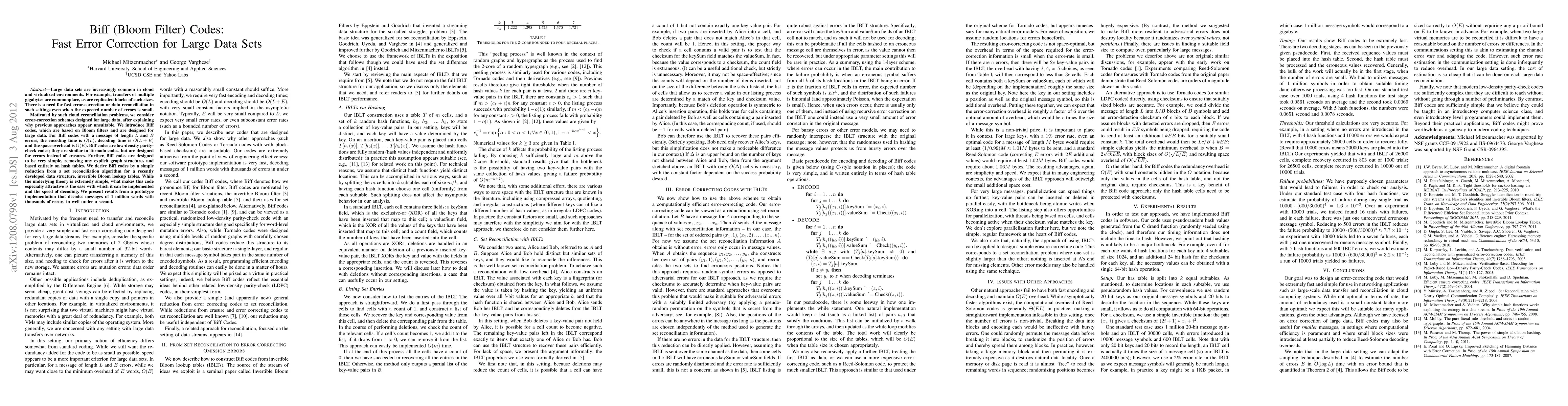 Biff codes offer fast error correction for large data sets with low space overhead, achieving encoding time of O(L), decoding time of O(L + E), and space overhead of O(E).