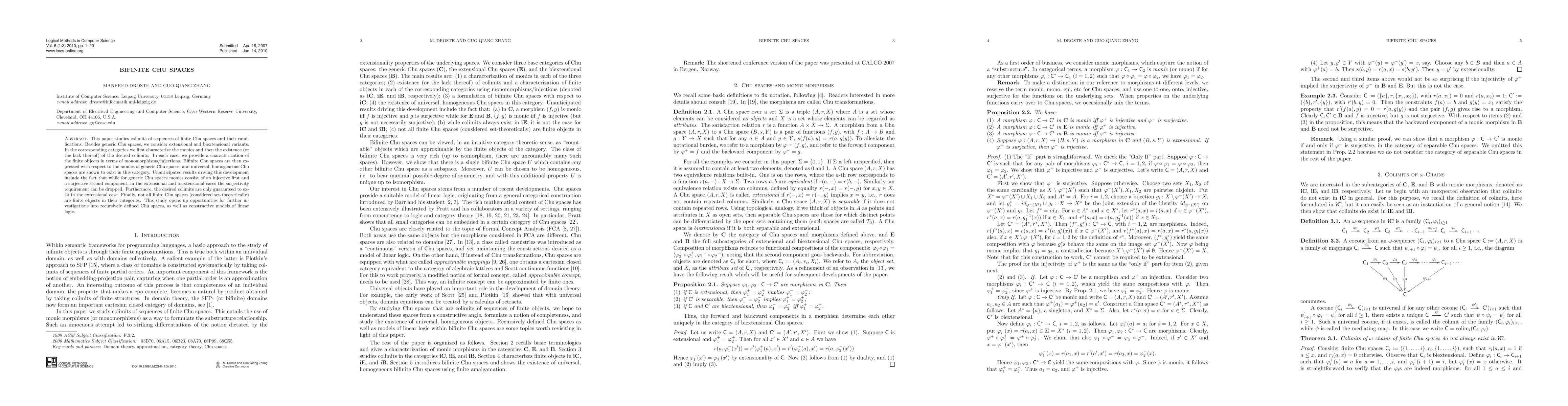 This paper studies colimits of sequences of finite Chu spaces and their ramifications. Besides generic Chu spaces, we consider extensional and biextensional variants. In the corresponding categories we first characterize the monics and then the existence (or the lack thereof) of the desired colimits. In each case, we provide a characterization of the finite objects in terms of monomorphisms/injections. Bifinite Chu spaces are then expressed with respect to the monics of generic Chu spaces, and universal, homogeneous Chu spaces are shown to exist in this category. Unanticipated results driving this development include the fact that while for generic Chu spaces monics consist of an injective first and a surjective second component, in the extensional and biextensional cases the surjectivity requirement can be dropped. Furthermore, the desired colimits are only guaranteed to exist in the extensional case. Finally, not all finite Chu spaces (considered set-theoretically) are finite objects in their categories. This study opens up opportunities for further investigations into recursively defined Chu spaces, as well as constructive models of linear logic.