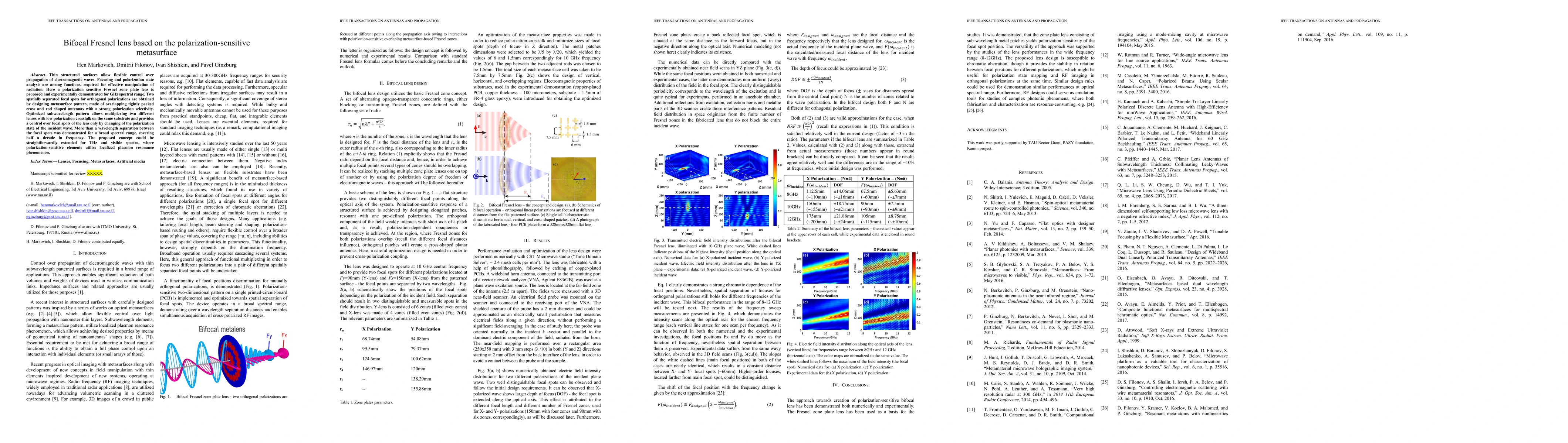 This paper proposes and demonstrates a polarization-sensitive Fresnel zone plate lens using a metasurface composed of cross and rod antennas, achieving two spatially separated focal spots for orthogonal polarizations in the GHz range. The design allows for multiplexing two lenses with low crosstalk on the same substrate, enabling control over focal spots via the polarization state of the incident wave.