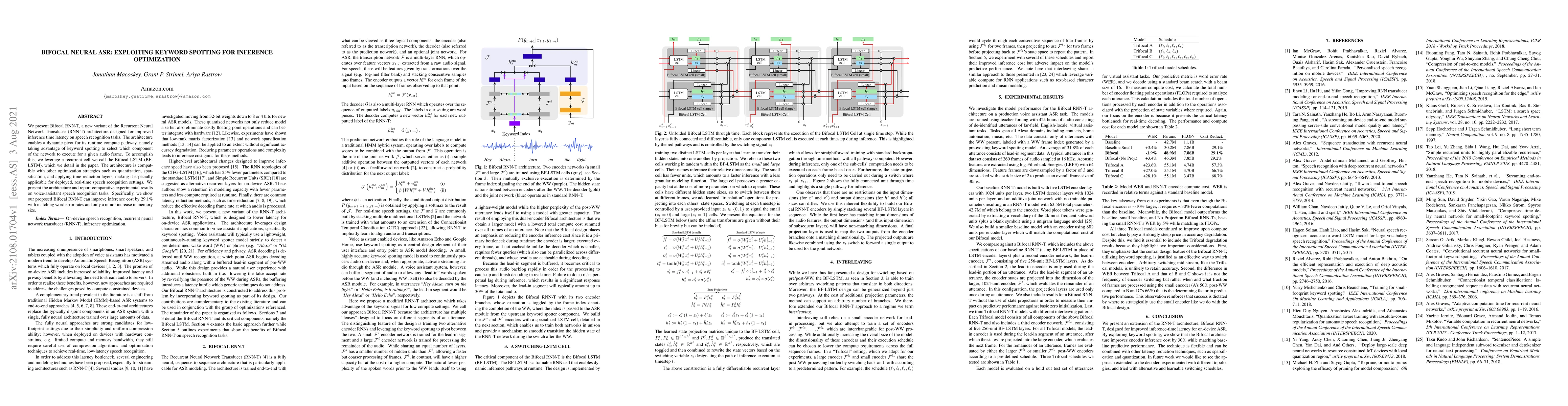 The paper introduces Bifocal RNN-T, a modified RNN-T architecture that optimizes inference time in speech recognition tasks. It uses a Bifocal LSTM to dynamically select network components based on keyword spotting, reducing inference cost by 29.1% with minimal changes to memory size and error rates.