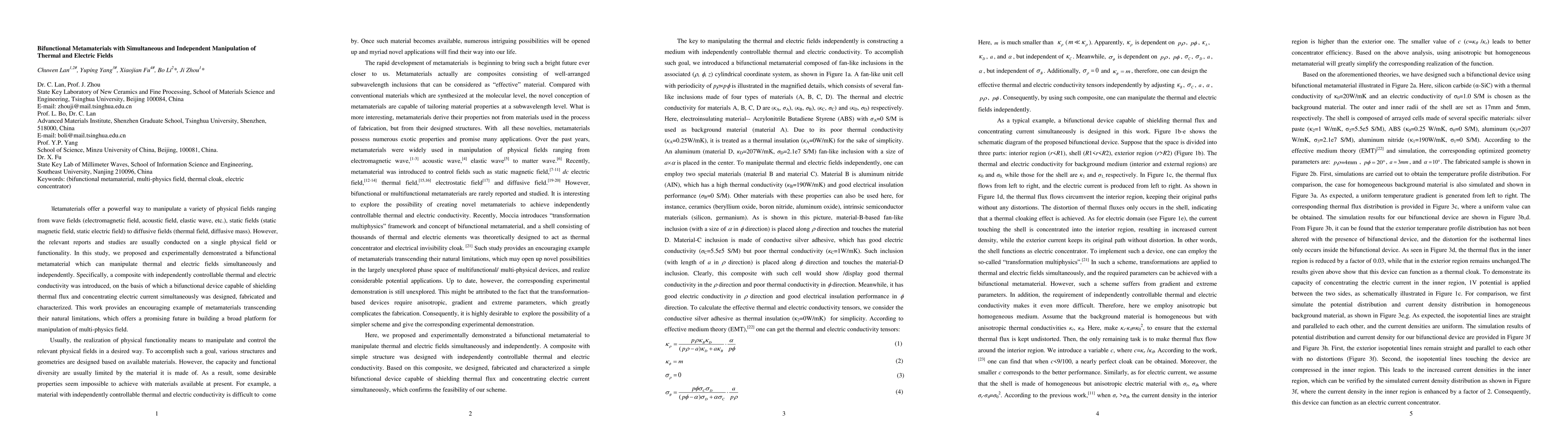 This paper proposes and demonstrates a bifunctional metamaterial that can independently manipulate both thermal and electric fields. The study introduces a composite material with controllable thermal and electric conductivities, leading to a device capable of simultaneously shielding thermal flux and concentrating electric current.