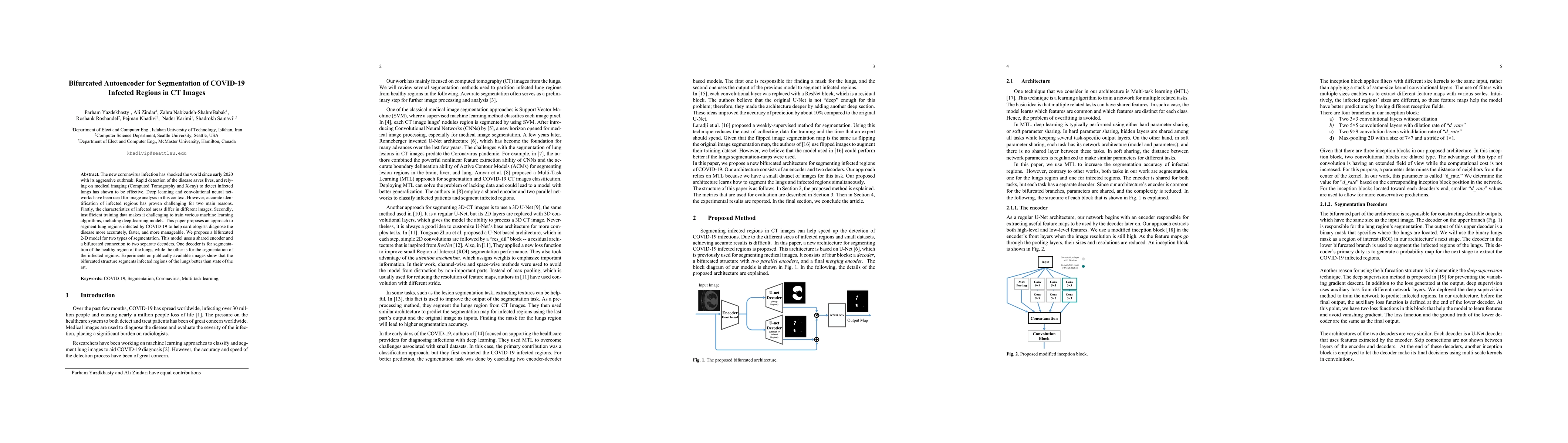 The new coronavirus infection has shocked the world since early 2020 with its aggressive outbreak. Rapid detection of the disease saves lives, and relying on medical imaging (Computed Tomography and X-ray) to detect infected lungs has shown to be effective. Deep learning and convolutional neural networks have been used for image analysis in this context. However, accurate identification of infected regions has proven challenging for two main reasons. Firstly, the characteristics of infected areas differ in different images. Secondly, insufficient training data makes it challenging to train various machine learning algorithms, including deep-learning models. This paper proposes an approach to segment lung regions infected by COVID-19 to help cardiologists diagnose the disease more accurately, faster, and more manageable. We propose a bifurcated 2-D model for two types of segmentation. This model uses a shared encoder and a bifurcated connection to two separate decoders. One decoder is for segmentation of the healthy region of the lungs, while the other is for the segmentation of the infected regions. Experiments on publically available images show that the bifurcated structure segments infected regions of the lungs better than state of the art.