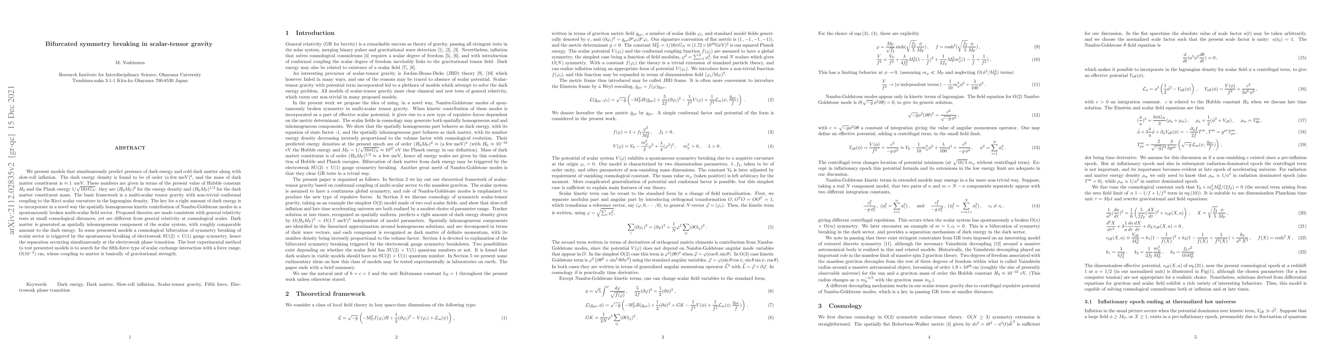 We present models that simultaneously predict presence of dark energy and cold dark matter along with slow-roll inflation. The dark energy density is found to be of order $({\rm a \;few \;meV})^4$, and the mass of dark matter constituent is $\approx 1\,$ meV. These numbers are given in terms of the present value of Hubble constant $H_0$ and the Plank energy $1/\sqrt{16 \pi G_N}$: they are $(H_0 M_{\rm P})^2$ for the energy density and $(H_0 M_{\rm P})^{1/2}$ for the dark matter constituent mass. The basic framework is a multi-scalar tensor gravity with non-trivial conformal coupling to the Ricci scalar curvature in the lagrangian density. The key for a right amount of dark energy is to incorporate in a novel way the spatially homogeneous kinetic contribution of Nambu-Goldstone modes in a spontaneously broken multi-scalar field sector. Proposed theories are made consistent with general relativity tests at small cosmological distances, yet are different from general relativity at cosmological scales. Dark matter is generated as spatially inhomogeneous component of the scalar system, with roughly comparable amount to the dark energy. In some presented models a cosmological bifurcation of symmetry breaking of scalar sector is triggered by the spontaneous breaking of electroweak SU(2) $\times $ U(1) gauge symmetry, hence the separation occurring simultaneously at the electroweak phase transition. The best experimental method to test presented models is to search for the fifth-force type of scalar exchange interaction with a force range, $O(10^{-2})$ cm, whose coupling to matter is basically of gravitational strength.