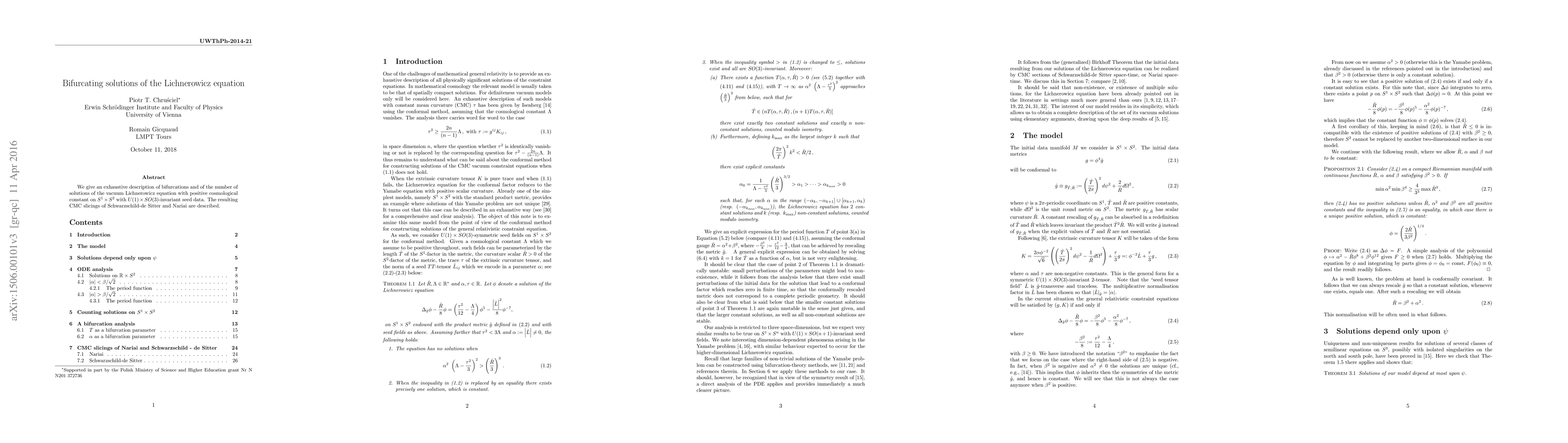 We give an exhaustive description of bifurcations and of the number of solutions of the vacuum Lichnerowicz equation with positive cosmological constant on $S^1\times S^2$ with $U(1)\times SO(3)$-invariant seed data. The resulting CMC slicings of Schwarzschild-de Sitter and Nariai are described.