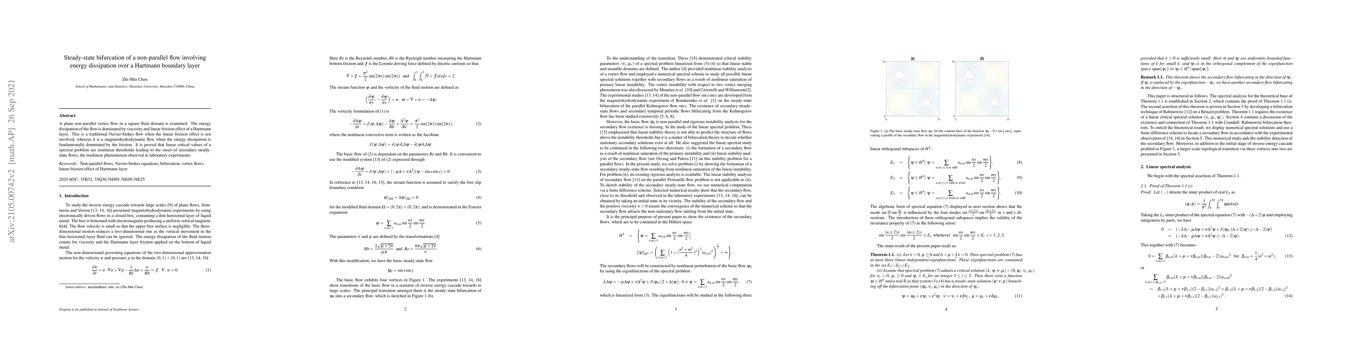 A plane non-parallel vortex flow in a square fluid domain is examined. The energy dissipation of the flow is dominated by viscosity and linear friction effect of a Hartmann layer. This is a traditional Navier-Stokes flow when the linear friction effect is not involved, whereas it is a magnetohydrodynamic flow when the energy dissipation is fundamentally dominated by the friction. It is proved that linear critical values of a spectral problem are nonlinear thresholds leading to the onset of secondary steady-state flows, the nonlinear phenomenon observed in laboratory experiments.