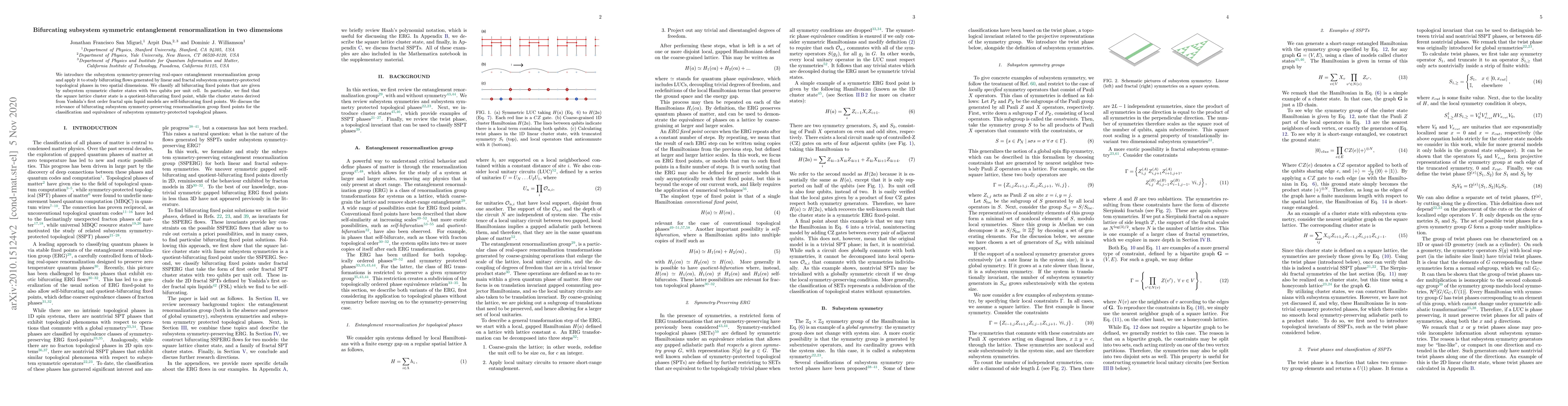 This paper develops a subsystem symmetry-preserving entanglement renormalization group to classify bifurcating fixed points in two-dimensional topological phases, identifying the square lattice cluster state and fractal spin liquid models as distinct self- and quotient-bifurcating fixed points, respectively. The study highlights the importance of these fixed points in understanding subsystem symmetry-protected topological phases.