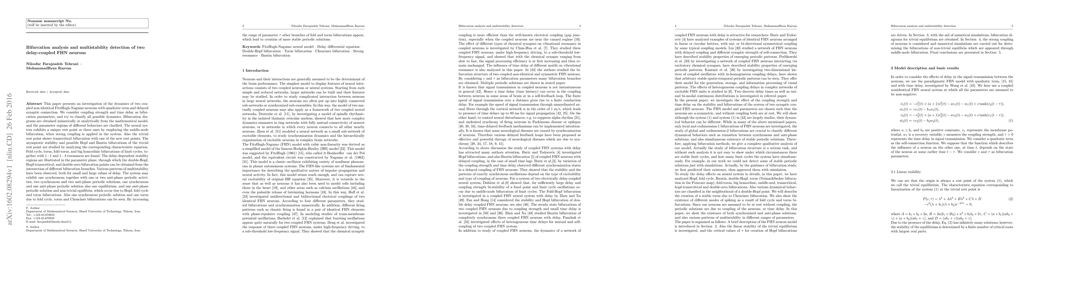 This paper presents an investigation of the dynamics of two coupled non-identical FitzHugh-Nagumo neurons with quadratic term and delayed synaptic connection. We consider coupling strength and time delay as bifurcation parameters, and try to classify all possible dynamics. Bifurcation diagrams are obtained numerically or analytically from the mathematical model, and the parameter regions of different behaviors are clarified. The neural system exhibits a unique rest point or three ones by employing the saddle-node bifurcation, when strong coupling is applied in the system. Also the trivial rest point shows transcritical bifurcation with one of the new rest points. The asymptotic stability and possible Hopf and Bautin bifurcations of the trivial rest point are studied by analyzing the corresponding characteristic equation. Fold cycle, torus, fold-torus, and big homoclinic bifurcations of limit cycles, together with $1:1$ and $1:4$ resonances are found. The delay-dependent stability regions are illustrated in the parameter plane, through which the double-Hopf, Hopf-transcritical, and double-zero bifurcation points can be obtained from the intersection of different bifurcation branches. Various patterns of multistability have been observed, both for small and large values of delay. The system may exhibit synchronous and anti-phase periodic solutions, which occur due to Hopf, fold cycle and torus bifurcations. By increasing the range of parameter $\tau$ other branches of fold and torus bifurcations appear, which lead to creation of more stable periodic solutions.