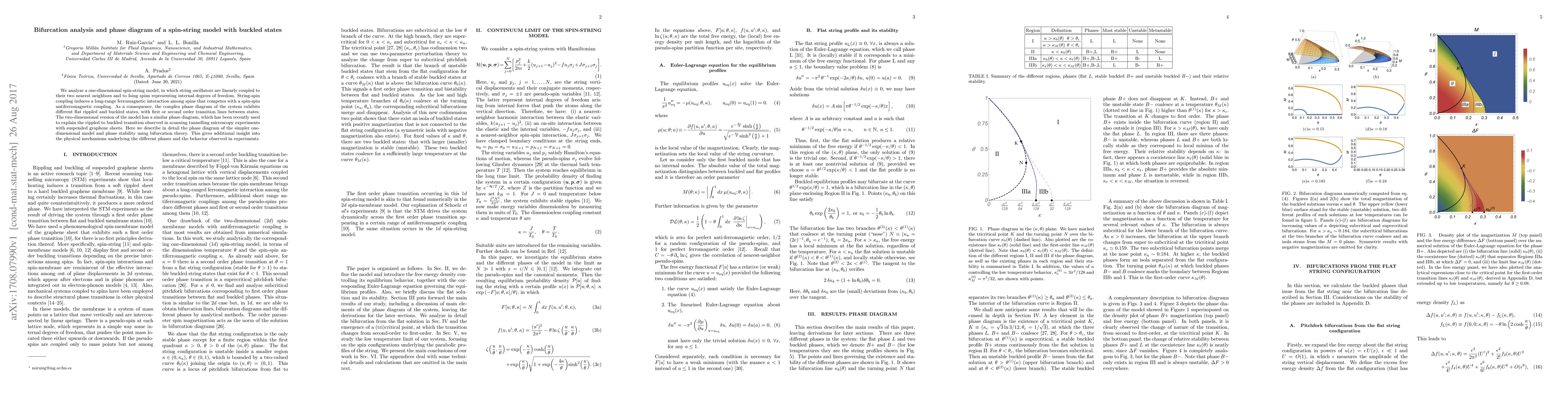 This paper analyzes a one-dimensional spin-string model with string oscillators coupled to Ising spins, revealing a complex phase diagram with buckled and rippled states. Bifurcation theory is used to explore the stability and transitions between these phases, providing insights into the physical mechanisms behind observed experimental behaviors in graphene sheets.