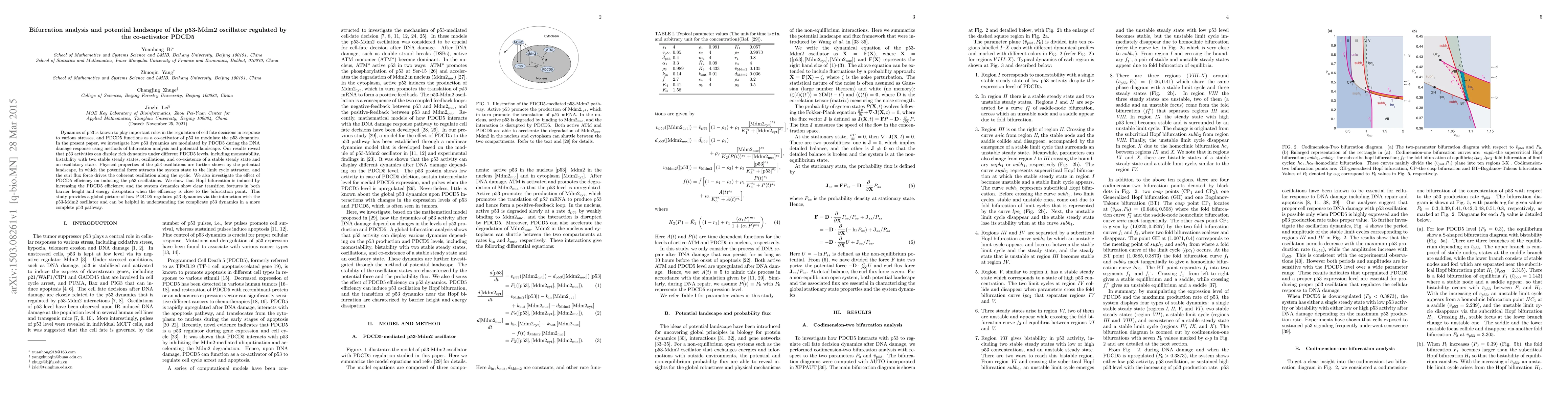 This paper employs bifurcation analysis and potential landscape methods to study how PDCD5 modulates p53 dynamics during DNA damage response, revealing diverse p53 activity states including oscillations, bistability, and stable steady states. The study shows that PDCD5 efficiency induces Hopf bifurcation, influencing the system's transition features and providing a comprehensive view of PDCD5's regulatory role in the p53-Mdm2 oscillator.