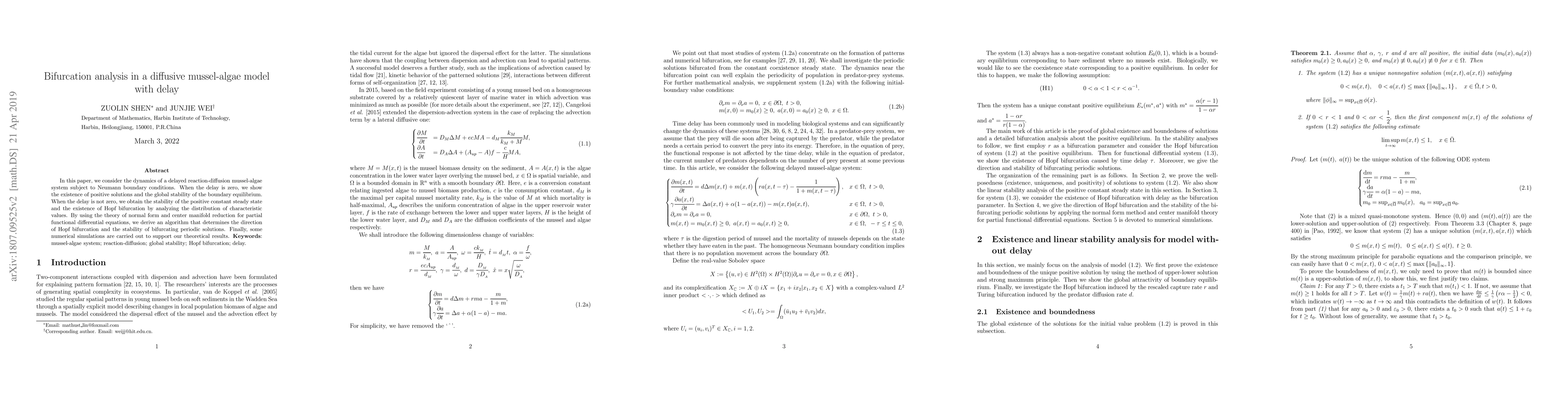 This paper investigates the dynamics of a diffusive mussel-algae model with delay, proving the stability and existence of positive solutions without delay. With delay, it finds Hopf bifurcation, determines bifurcation direction and stability, and supports findings with numerical simulations.