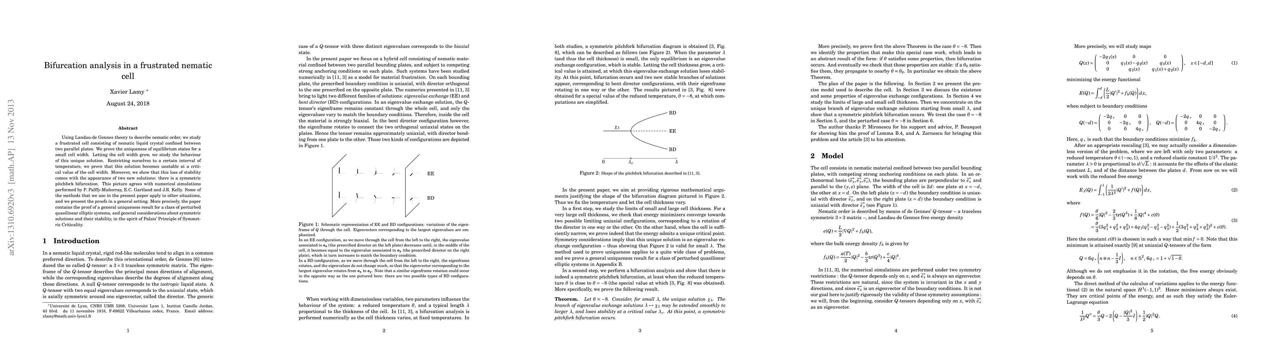Researchers study a frustrated nematic cell using Landau-de Gennes theory and find that increasing the cell width leads to a pitchfork bifurcation, resulting in two new stable solutions as one of the original solutions becomes unstable.