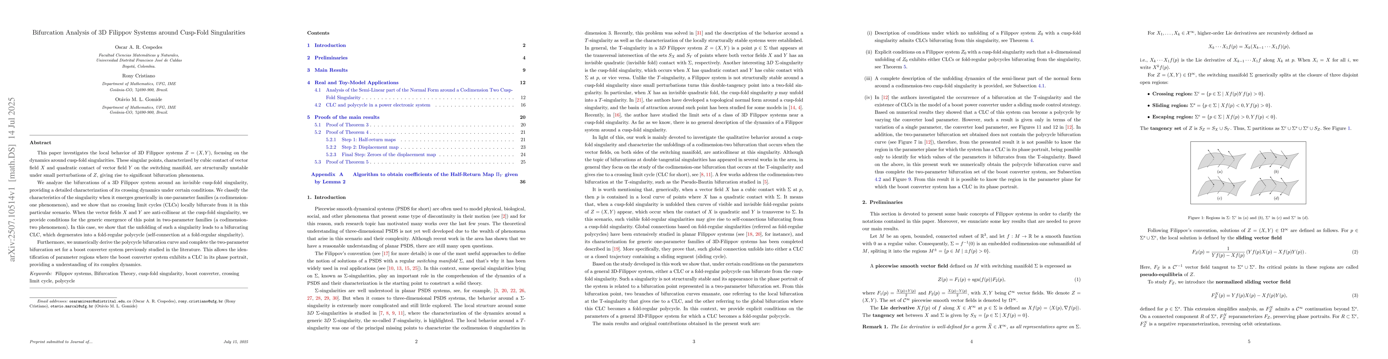 This research analyzes the dynamics of 3D Filippov systems near cusp-fold singularities, showing no local bifurcation of crossing limit cycles in one-parameter families. In two-parameter families, it identifies conditions for generic singularity emergence and reveals that a bifurcating CLC degenerates into a fold-regular polycycle. Numerical derivations are applied to a boost converter system, mapping its phase portrait and identifying CLC parameter regions, enhancing understanding of its complex dynamics.