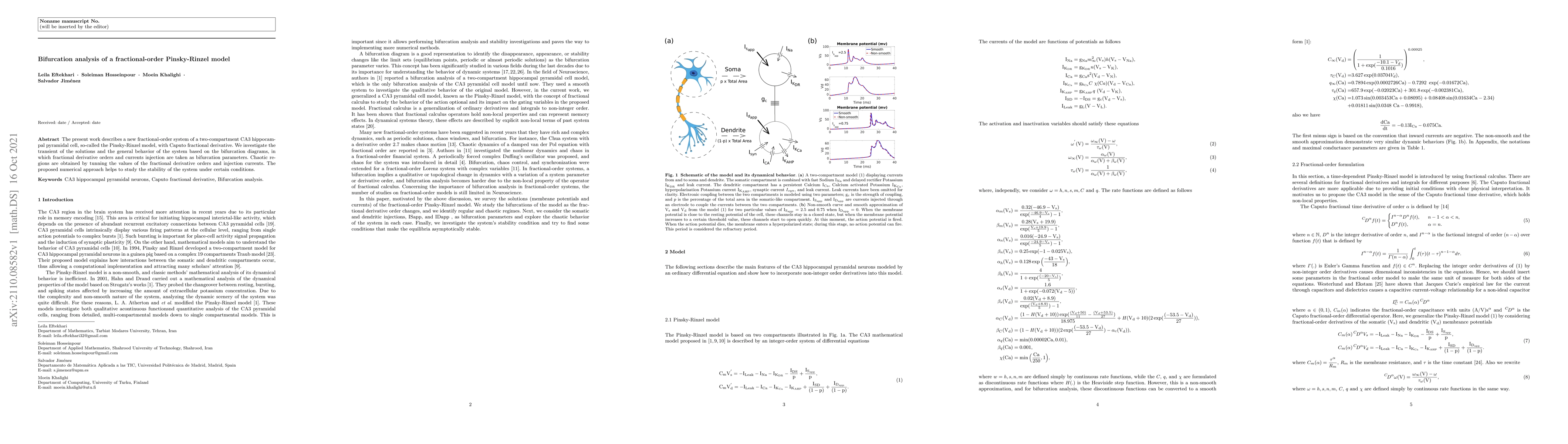Abstract The present work describes a new fractional-order system of a two-compartment CA3 hippocampal pyramidal cell, which is known as Pinsky-Rinzel model with Caputo fractional derivative. Firstly, The transient of the solutions is investigated. Then based on the bifurcation diagrams, we study the general behavior of the system. In this case, fractional derivative order and currents injection, are taken as bifurcation parameters. Chaotic regions are obtained for different values of the fractional derivative order and different injection currents. Finally, a numerical approach is introduced to study the stability of the system under certain conditions. The obtained results can be considered as help to control relevant diseases caused by maximal injection currents abnormality.