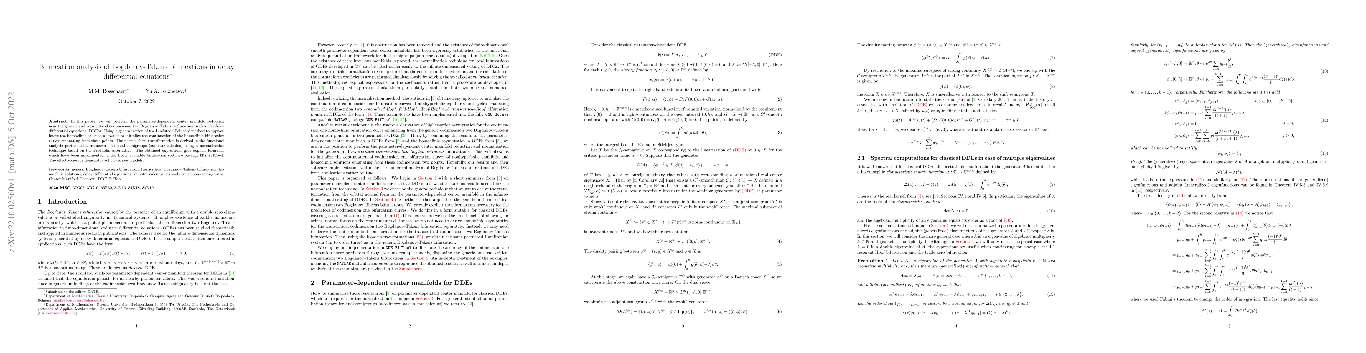 This paper investigates the bifurcation analysis of Bogdanov-Takens bifurcations in delay differential equations, employing center manifold reduction and the Lindstedt-Poincaré method to approximate homoclinic solutions. The results are implemented in DDE-BifTool and validated through various models.