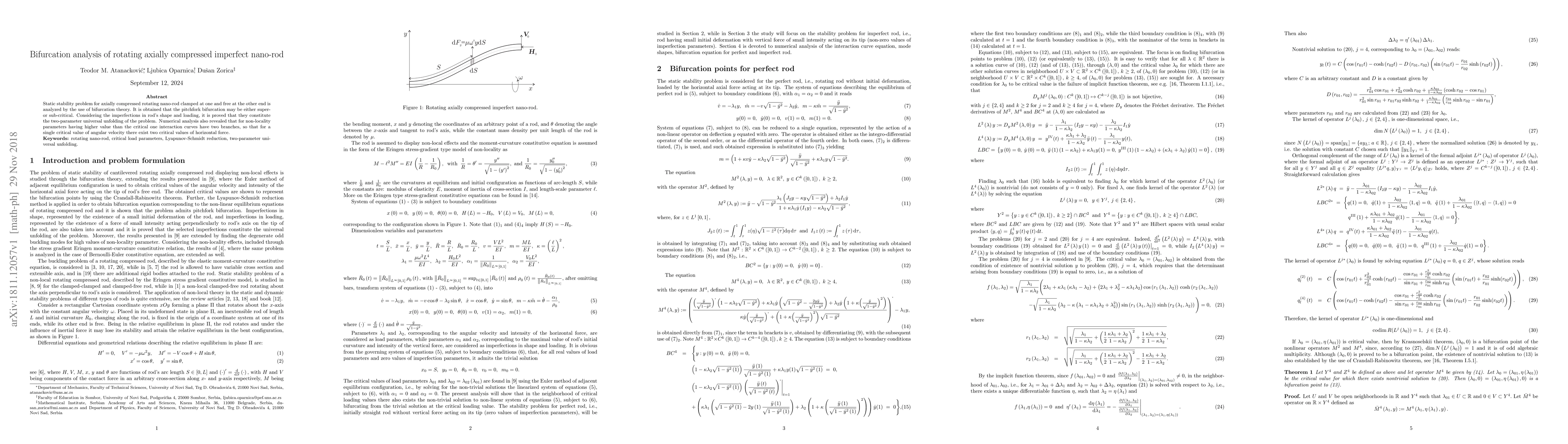 Researchers studied the stability of axially compressed rotating nano-rod using bifurcation theory, finding that imperfections can lead to two possible critical values of angular velocity for a single force value.