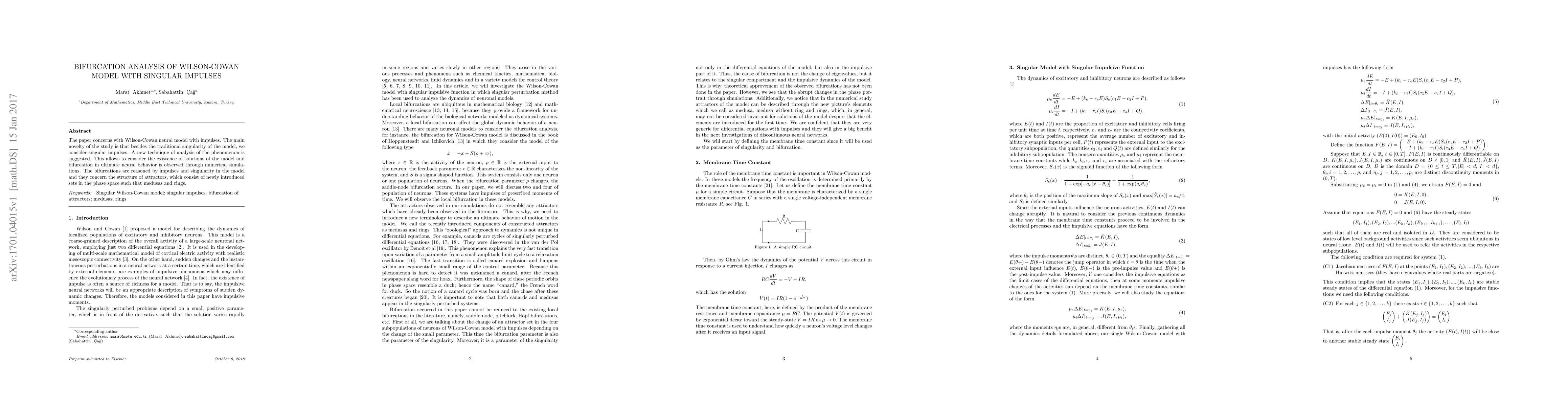 The paper concerns with Wilson-Cowan neural model with impulses. The main novelty of the study is that besides the traditional singularity of the model, we consider singular impulses. A new technique of analysis of the phenomenon is suggested. This allows to consider the existence of solutions of the model and bifurcation in ultimate neural behavior is observed through numerical simulations. The bifurcations are reasoned by impulses and singularity in the model and they concern the structure of attractors, which consist of newly introduced sets in the phase space such that medusas and rings.