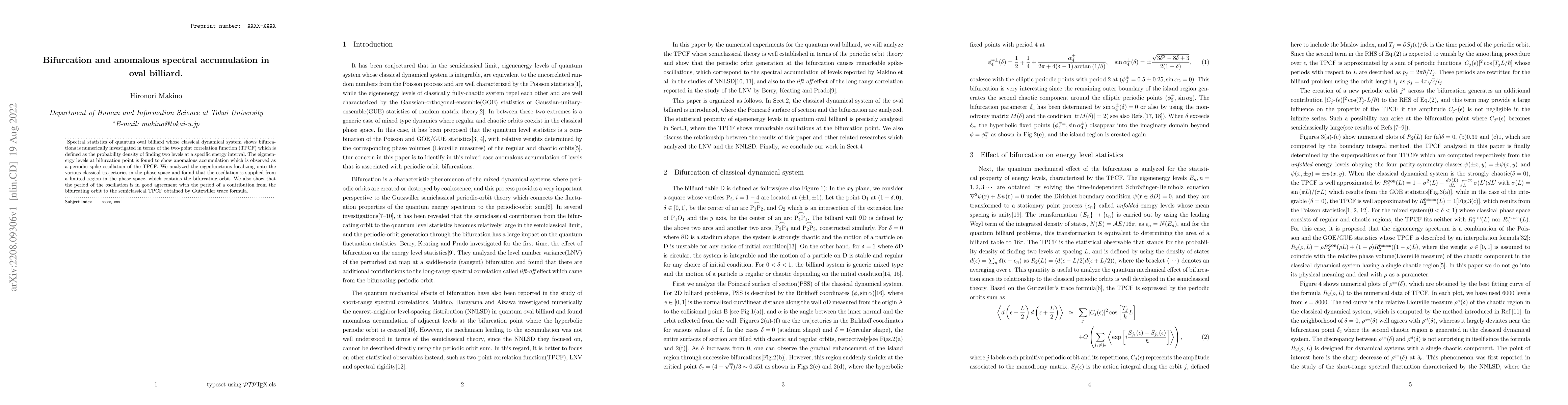 This paper investigates the spectral statistics of a quantum oval billiard system, revealing anomalous spectral accumulation at bifurcation points through a two-point correlation function analysis. The study finds that the eigenenergy levels exhibit periodic spike oscillations, which correlate with the period of the bifurcating orbit in the classical phase space.