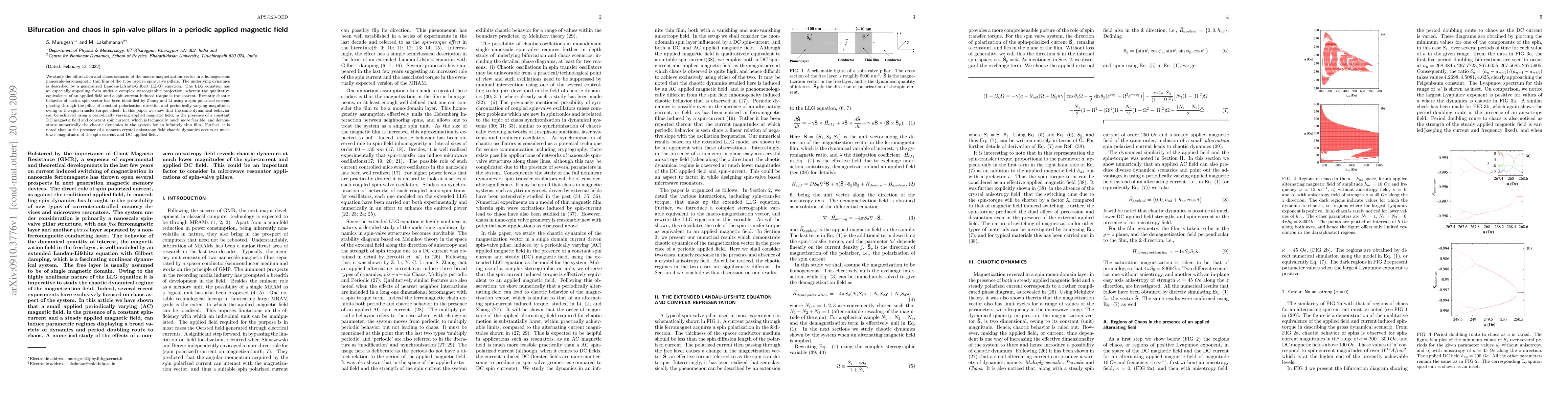 We study the bifurcation and chaos scenario of the macro-magnetization vector in a homogeneous nanoscale-ferromagnetic thin film of the type used in spin-valve pillars. The underlying dynamics is described by a generalized Landau-Lifshitz-Gilbert (LLG) equation. The LLG equation has an especially appealing form under a complex stereographic projection, wherein the qualitative equivalence of an applied field and a spin-current induced torque is transparent. Recently chaotic behavior of such a spin vector has been identified by Zhang and Li using a spin polarized current passing through the pillar of constant polarization direction and periodically varying magnitude, owing to the spin-transfer torque effect. In this paper we show that the same dynamical behavior can be achieved using a periodically varying applied magnetic field, in the presence of a constant DC magnetic field and constant spin current, which is technically much more feasible, and demonstrate numerically the chaotic dynamics in the system for an infinitely thin film. Further, it is noted that in the presence of a nonzero crystal anisotropy field chaotic dynamics occurs at much lower magnitudes of the spin-current and DC applied field.