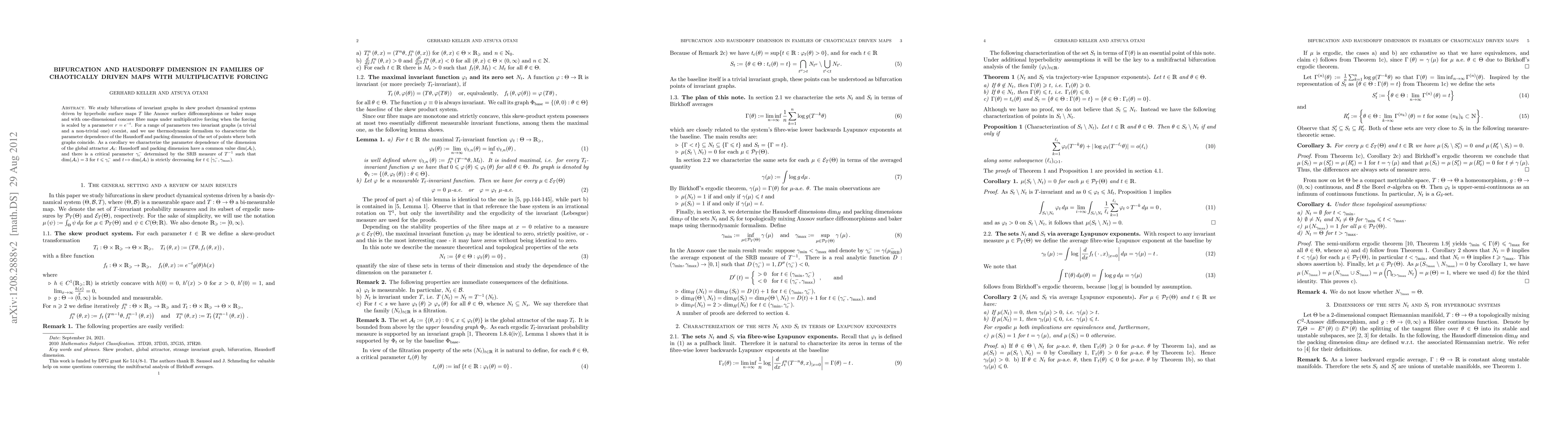 Researchers studied bifurcations in chaotic systems driven by surface maps with multiplicative forcing, finding that the Hausdorff dimension of the global attractor changes as a parameter varies, with a critical point at which it decreases.