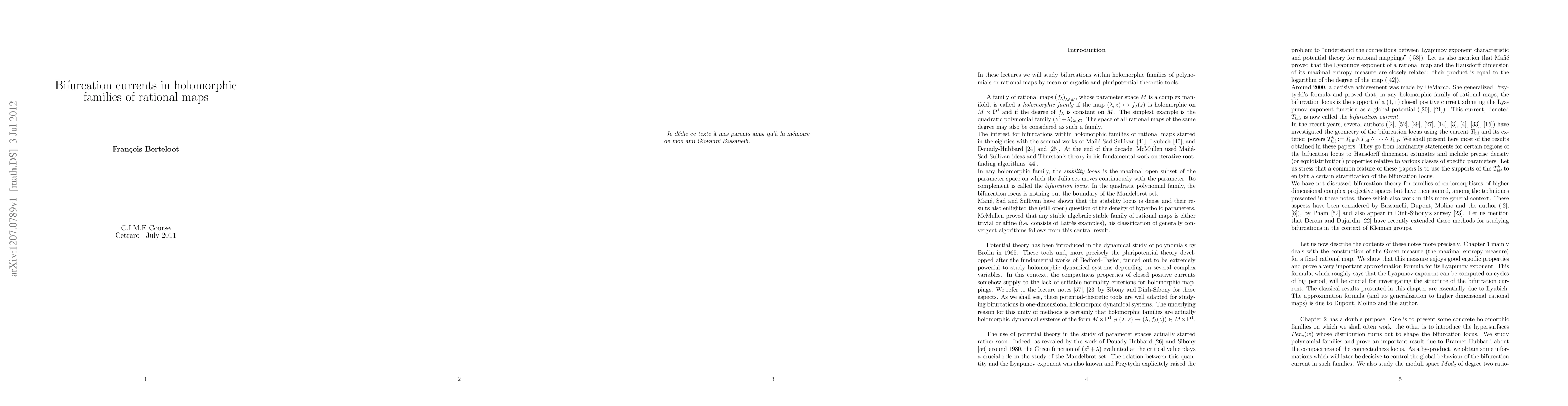The aim of these lectures is the study of bifurcations within holomorphic families of polynomials or rational maps by mean of ergodic and pluripotential theoretic tools.