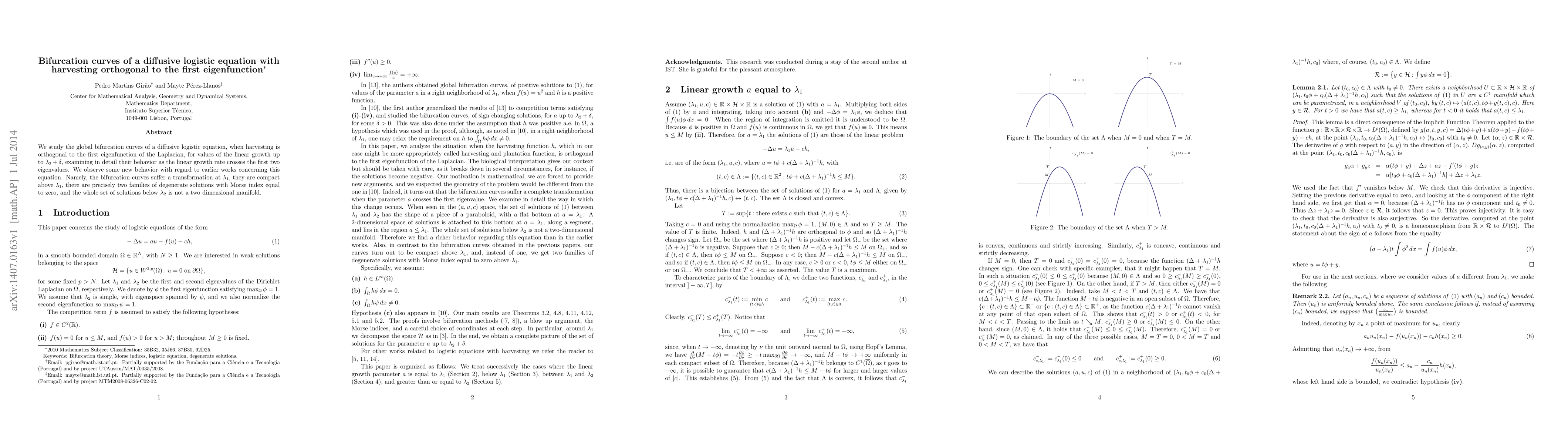 Researchers study global bifurcation curves of a diffusive logistic equation with harvesting, observing new behavior when linear growth rate crosses first eigenvalue, including transformation, compactness above, and degenerate solutions with zero Morse index.
