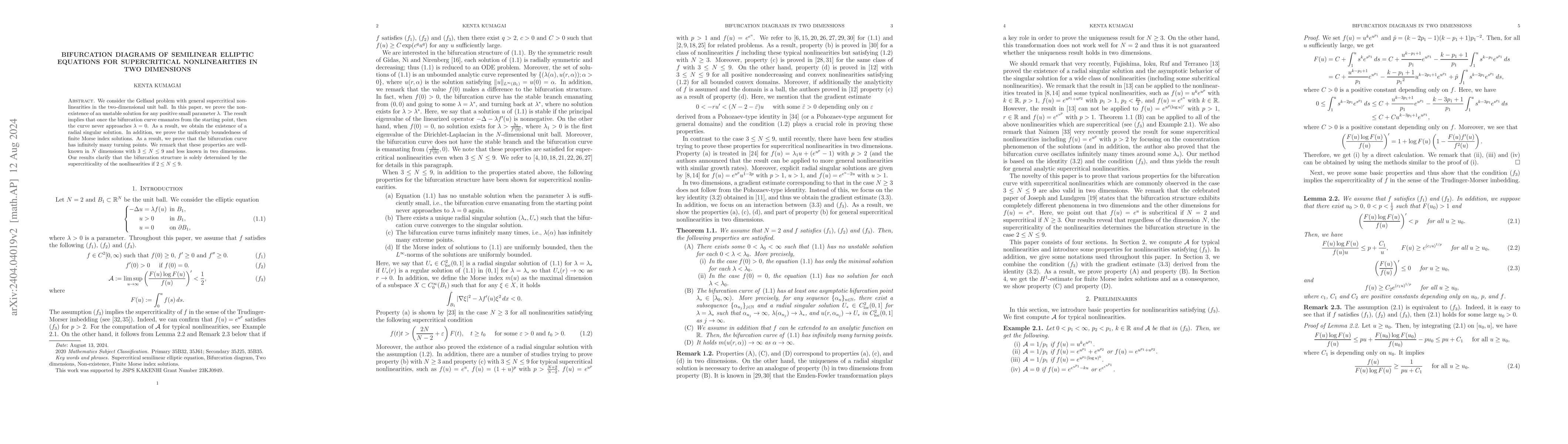 This paper investigates the Gelfand problem for supercritical nonlinearities in two dimensions, proving the non-existence of unstable solutions and the boundedness of finite Morse index solutions, leading to the existence of a radial singular solution and infinite turning points on the bifurcation curve. The key proof technique involves combining gradient estimates with the nature of supercritical nonlinearities.