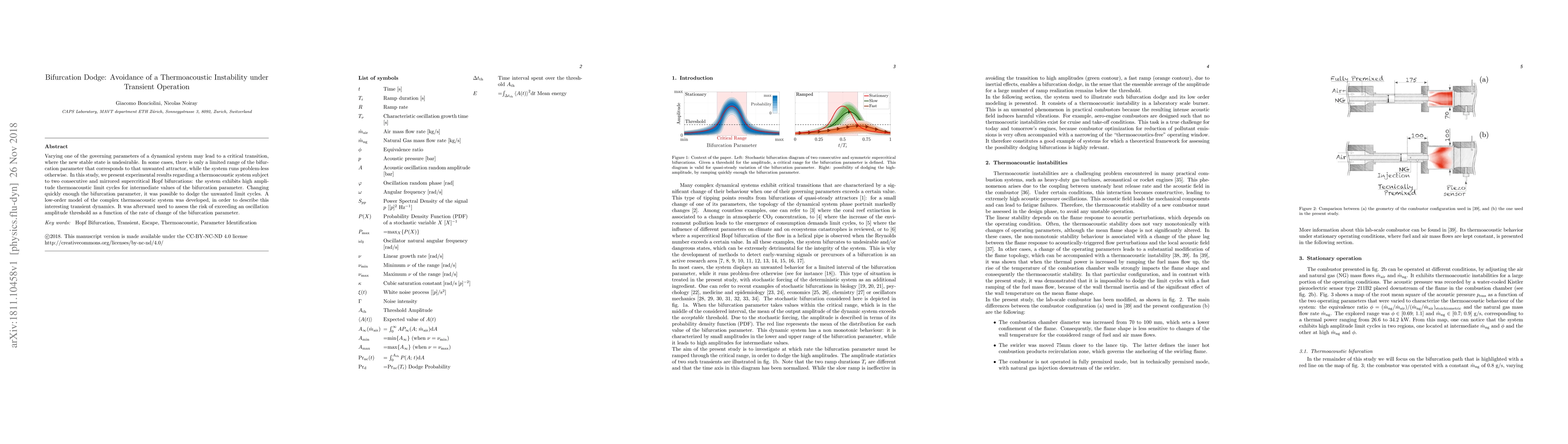 Varying one of the governing parameters of a dynamical system may lead to a critical transition, where the new stable state is undesirable. In some cases, there is only a limited range of the bifurcation parameter that corresponds to that unwanted attractor, while the system runs problem-less otherwise. In this study, we present experimental results regarding a thermoacoustic system subject to two consecutive and mirrored supercritical Hopf bifurcations: the system exhibits high amplitude thermoacoustic limit cycles for intermediate values of the bifurcation parameter. Changing quickly enough the bifurcation parameter, it was possible to dodge the unwanted limit cycles. A low-order model of the complex thermoacoustic system was developed, in order to describe this interesting transient dynamics. It was afterward used to assess the risk of exceeding an oscillation amplitude threshold as a function of the rate of change of the bifurcation parameter.