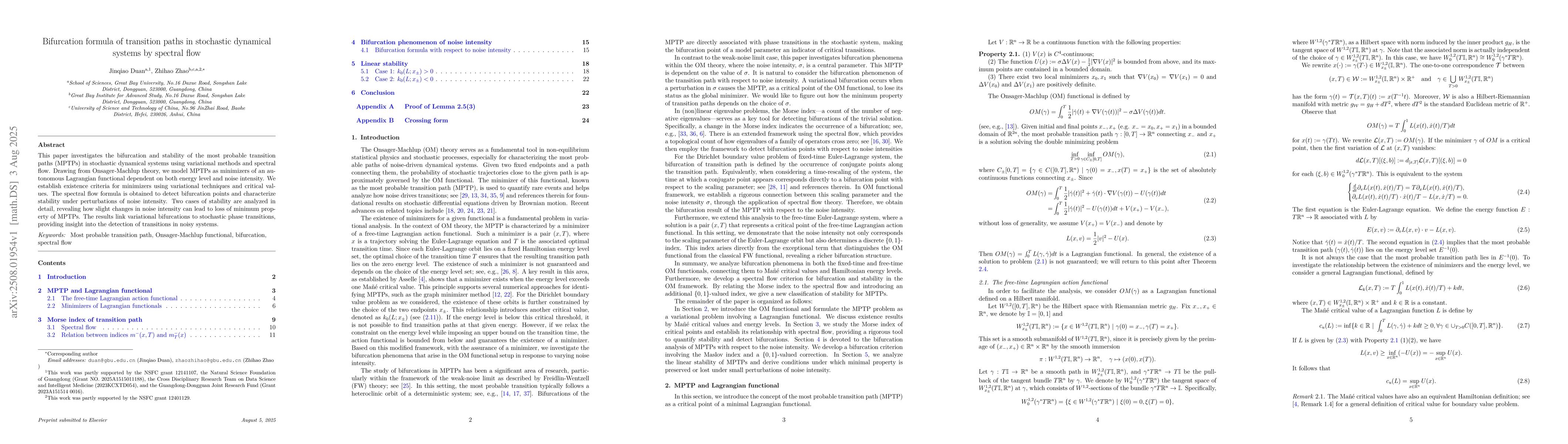 This paper investigates the bifurcation and stability of the most probable transition paths (MPTPs) in stochastic dynamical systems using variational methods and spectral flow. Drawing from Onsager-Machlup theory, we model MPTPs as minimizers of an autonomous Lagrangian functional dependent on both energy level and noise intensity. We establish existence criteria for minimizers using variational techniques and critical values. The spectral flow formula is obtained to detect bifurcation points and characterize stability under perturbations of noise intensity. Two cases of stability are analyzed in detail, revealing how slight changes in noise intensity can lead to loss of minimum property of MPTPs. The results link variational bifurcations to stochastic phase transitions, providing insight into the detection of transitions in noisy systems.