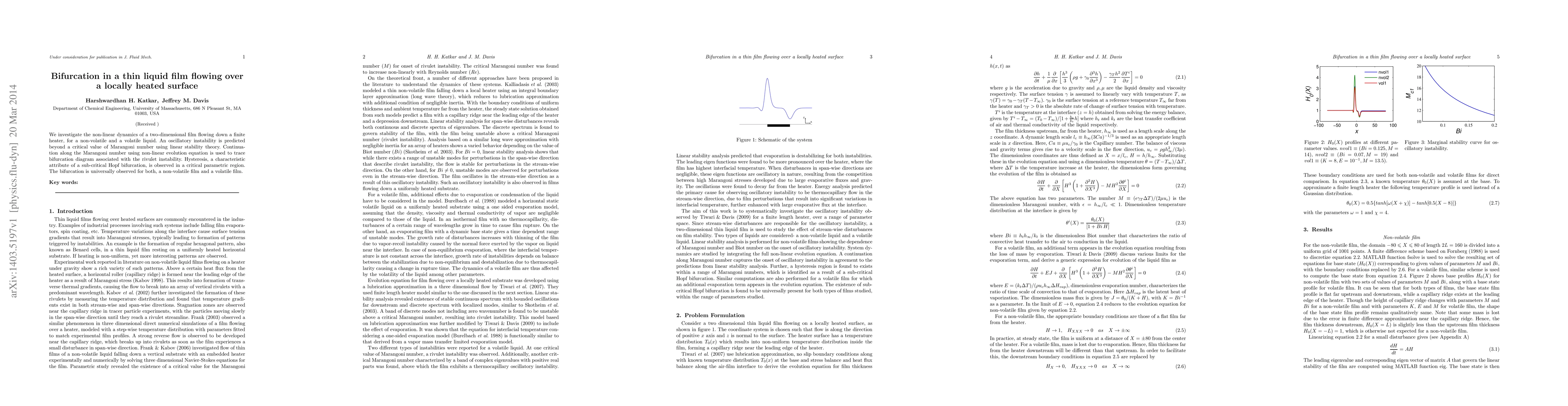 This paper explores the non-linear dynamics of thin liquid films flowing over a locally heated surface, predicting oscillatory instability beyond a critical Marangoni number. It reveals a bifurcation phenomenon with hysteresis observed in both non-volatile and volatile films, indicating universal behavior in the system.