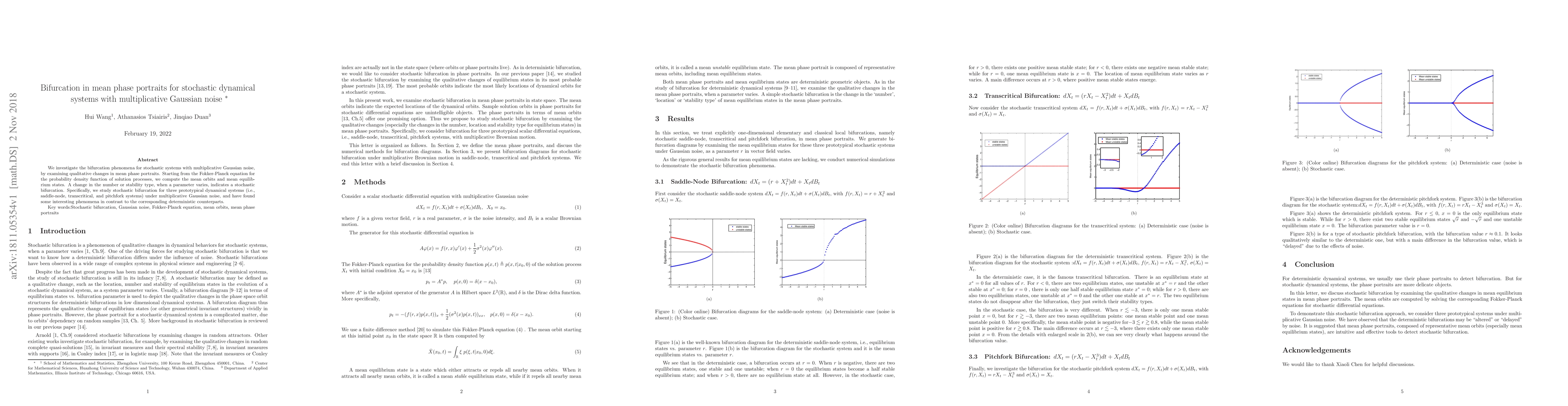 This paper examines bifurcation phenomena in stochastic dynamical systems subject to multiplicative Gaussian noise, focusing on qualitative changes in mean phase portraits. It identifies stochastic bifurcations by changes in mean orbits and equilibrium states, revealing unique behaviors in three prototypical systems compared to their deterministic analogs.