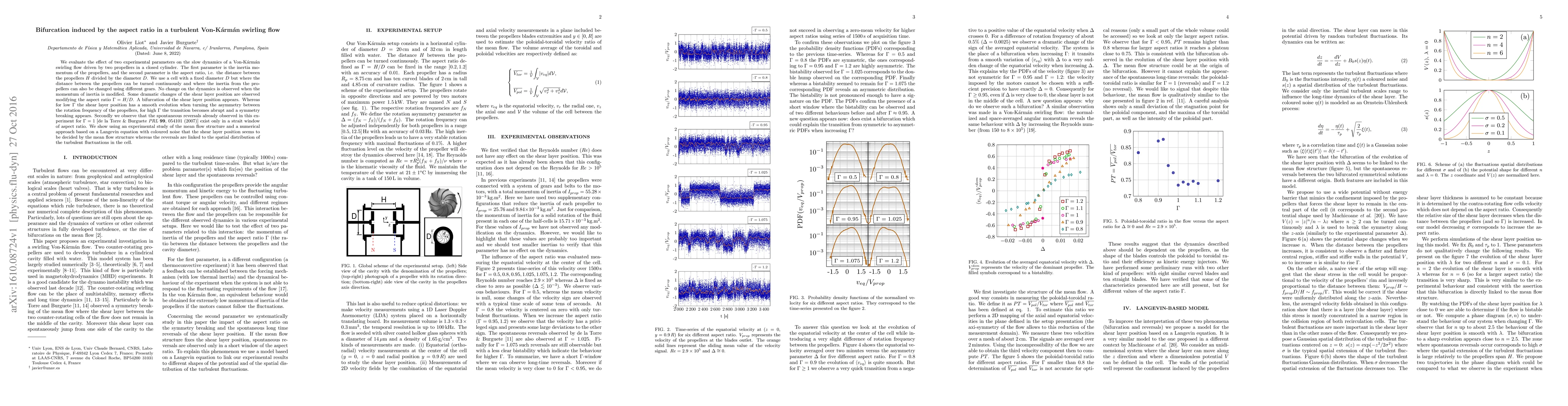 We evaluate the effect of two experimental parameters on the slow dynamics of a Von-K\'arm\'an swirling flow driven by two propellers in a closed cylinder. The first parameter is the inertia mo- mentum of the propellers, and the second parameter is the aspect ratio, i.e. the distance between the propellers $H$ divided by the diameter $D$. We use a cell with a fixed diameter $D$ but where the distance between the propellers can be turned continuously and where the inertia from the pro- pellers can also be changed using different gears. No change on the dynamics is observed when the momentum of inertia is modified. Some dramatic changes of the shear layer position are observed modifying the aspect ratio $\Gamma=H/D$. A bifurcation of the shear layer position appears. Whereas for low $\Gamma$ the shear layer position has a smooth evolution when turning the asymmetry between the rotation frequency of the propellers, for high $\Gamma$ the transition becomes abrupt and a symmetry breaking appears. Secondly we observe that the spontaneous reversals already observed in this ex- periment for $\Gamma=1$ [de la Torre & Burguete PRL 99, 054101 (2007)] exist only in a strait window of aspect ratio. We show using an experimental study of the mean flow structure and a numerical approach based on a Langevin equation with coloured noise that the shear layer position seems to be decided by the mean flow structure whereas the reversals are linked to the spatial distribution of the turbulent fluctuations in the cell.