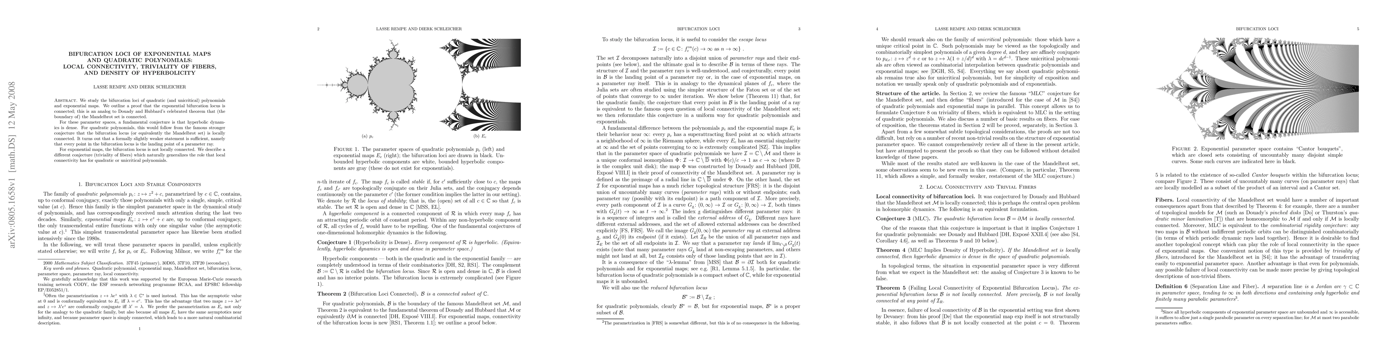 We study the bifurcation loci of quadratic (and unicritical) polynomials and exponential maps. We outline a proof that the exponential bifurcation locus is connected; this is an analog to Douady and Hubbard's celebrated theorem that (the boundary of) the Mandelbrot set is connected. For these parameter spaces, a fundamental conjecture is that hyperbolic dynamics is dense. For quadratic polynomials, this would follow from the famous stronger conjecture that the bifurcation locus (or equivalently the Mandelbrot set) is locally connected. It turns out that a formally slightly weaker statement is sufficient, namely that every point in the bifurcation locus is the landing point of a parameter ray. For exponential maps, the bifurcation locus is not locally connected. We describe a different conjecture (triviality of fibers) which naturally generalizes the role that local connectivity has for quadratic or unicritical polynomials.
