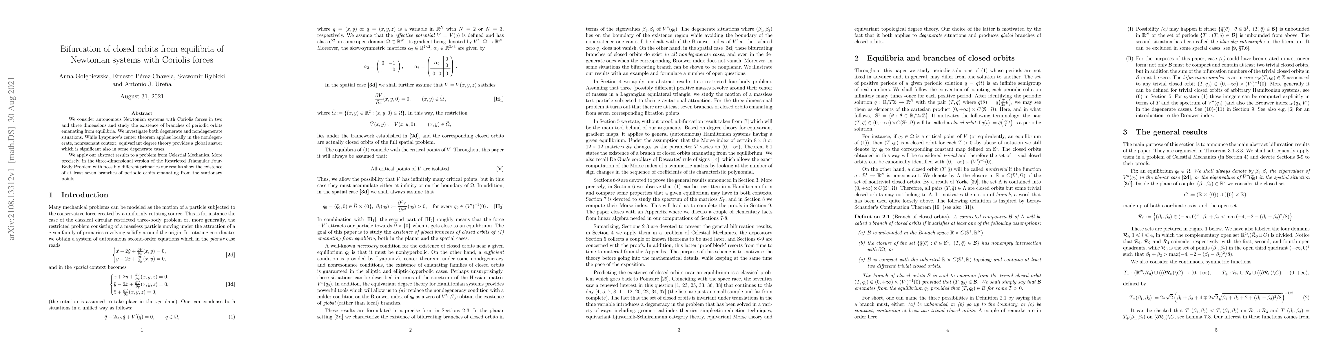 We consider autonomous Newtonian systems with Coriolis forces in two and three dimensions and study the existence of branches of periodic orbits emanating from equilibria. We investigate both degenerate and nondegenerate situations. While Lyapunov's center theorem applies locally in the nondegenerate, nonresonant context, equivariant degree theory provides a global answer which is significant also in some degenerate cases. We apply our abstract results to a problem from Celestial Mechanics. More precisely, in the three-dimensional version of the Restricted Triangular Four Body Problem with possibly different primaries our results show the existence of at least seven branches of periodic orbits emanating from the stationary points.