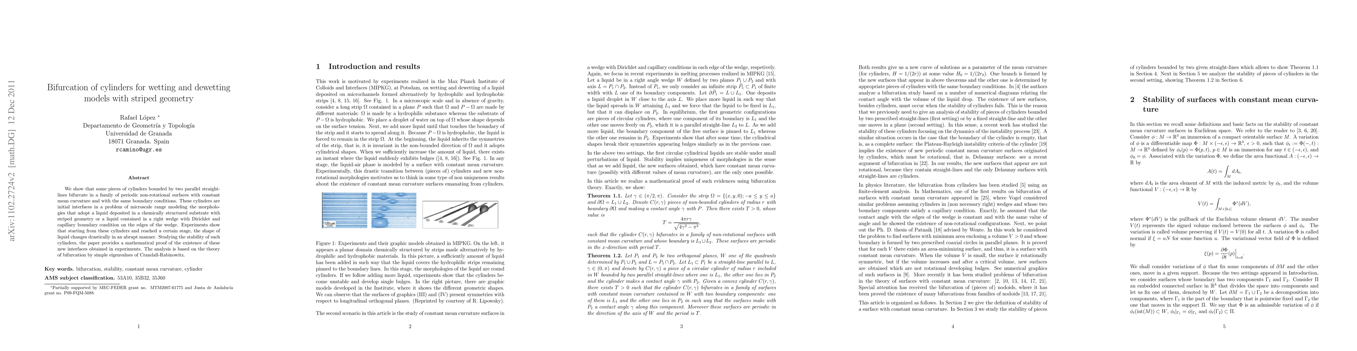 We show that some pieces of cylinders bounded by two parallel straight-lines bifurcate in a family of periodic non-rotational surfaces with constant mean curvature and with the same boundary conditions. These cylinders are initial interfaces in a problem of microscale range modeling the morphologies that adopt a liquid deposited in a chemically structured substrate with striped geometry or a liquid contained in a right wedge with Dirichlet and capillary boundary condition on the edges of the wedge. Experiments show that starting from these cylinders and once reached a certain stage, the shape of the liquid changes drastically in an abrupt manner. Studying the stability of such cylinders, the paper provides a mathematical proof of the existence of these new interfaces obtained in experiments. The analysis is based on the theory of bifurcation by simple eigenvalues of Crandall-Rabinowitz.
