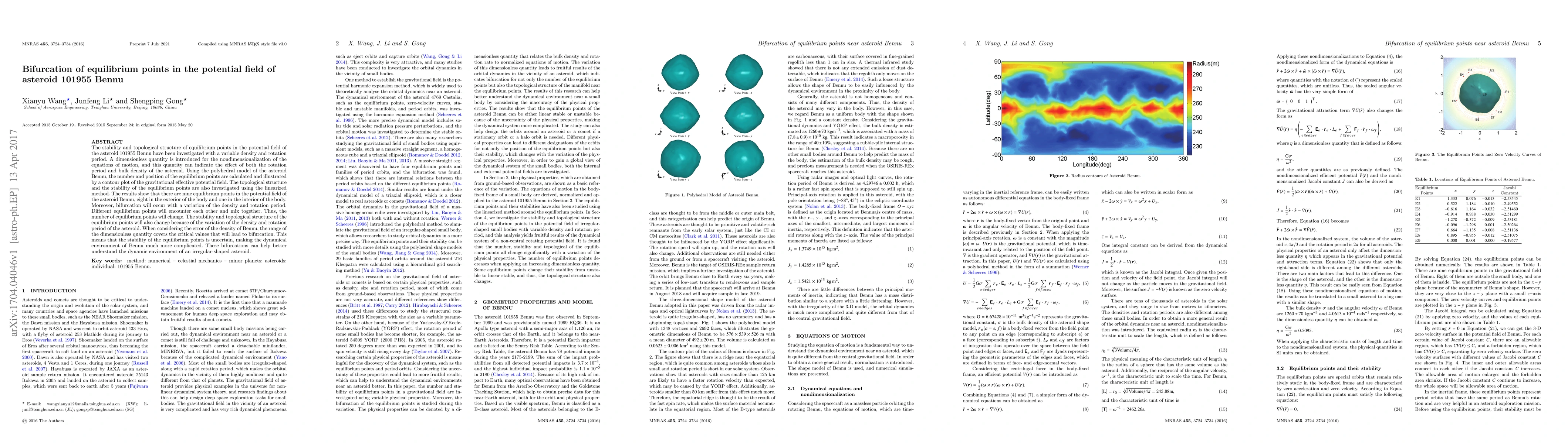 Asteroid 101955 Bennu has nine equilibrium points in its potential field, with two bifurcations occurring as density and rotation period vary, affecting stability and topological structure.