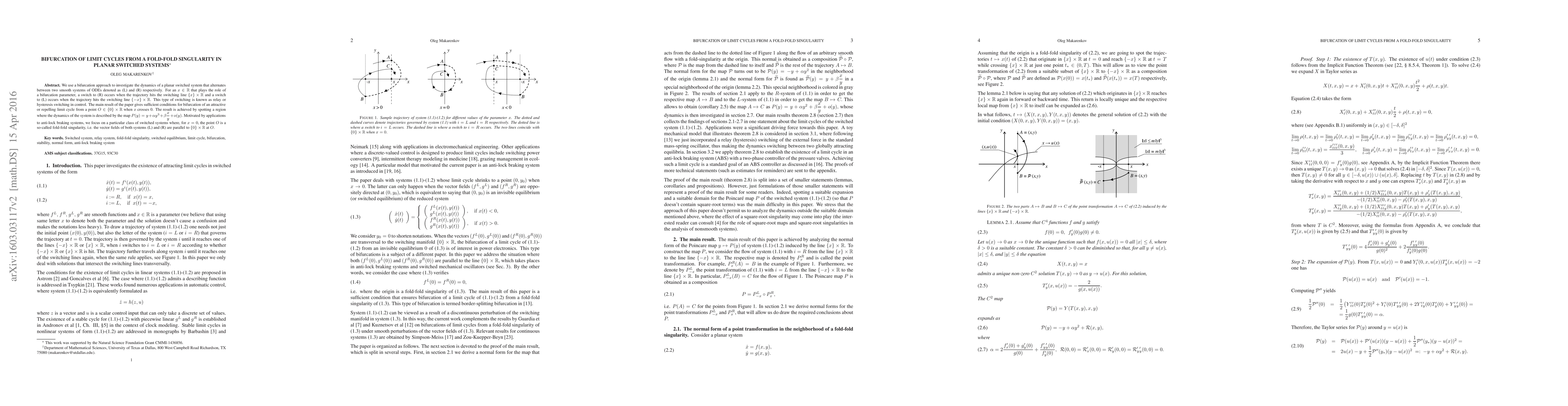 The paper extends fold bifurcation theory to planar switched systems with a fold-fold singularity, providing a method to achieve desired limit cycles in ABS and similar control systems.