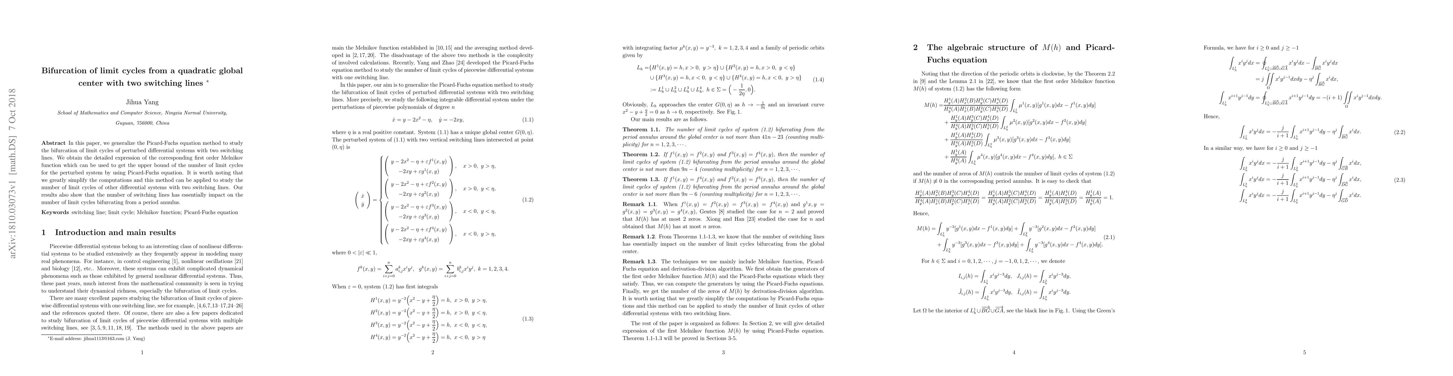 This paper generalizes the Picard-Fuchs equation method to analyze the bifurcation of limit cycles in perturbed differential systems with two switching lines, obtaining an expression for the first-order Melnikov function to determine the upper bound of limit cycles. The method simplifies computations and can be applied to other systems with similar properties.