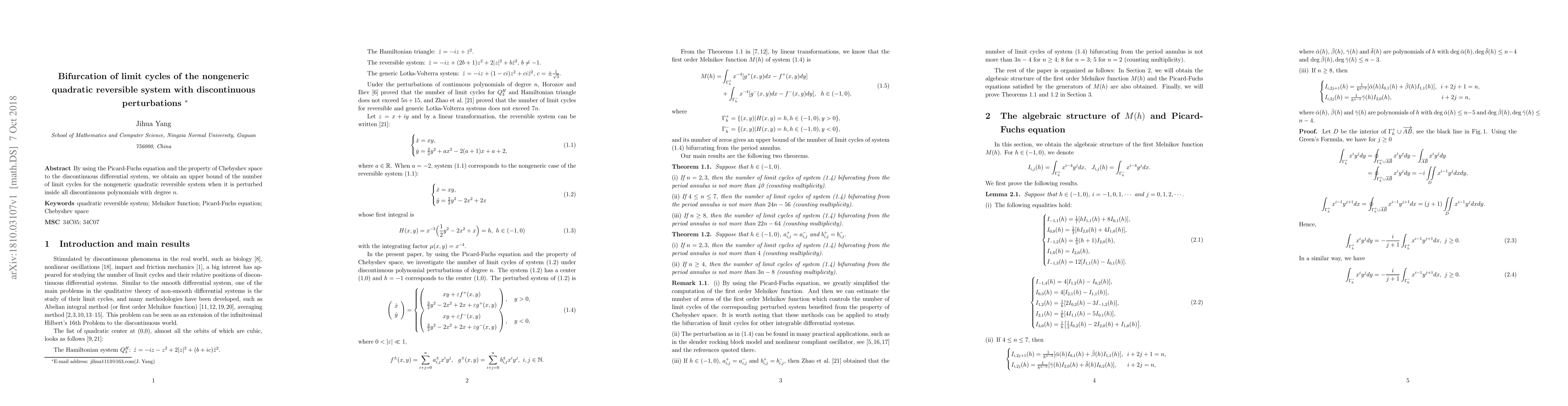 This research applies the Picard-Fuchs equation and Chebyshev space properties to a discontinuous differential system, establishing an upper limit on the number of limit cycles in a non-generic quadratic reversible system subjected to discontinuous polynomial perturbations of degree n.