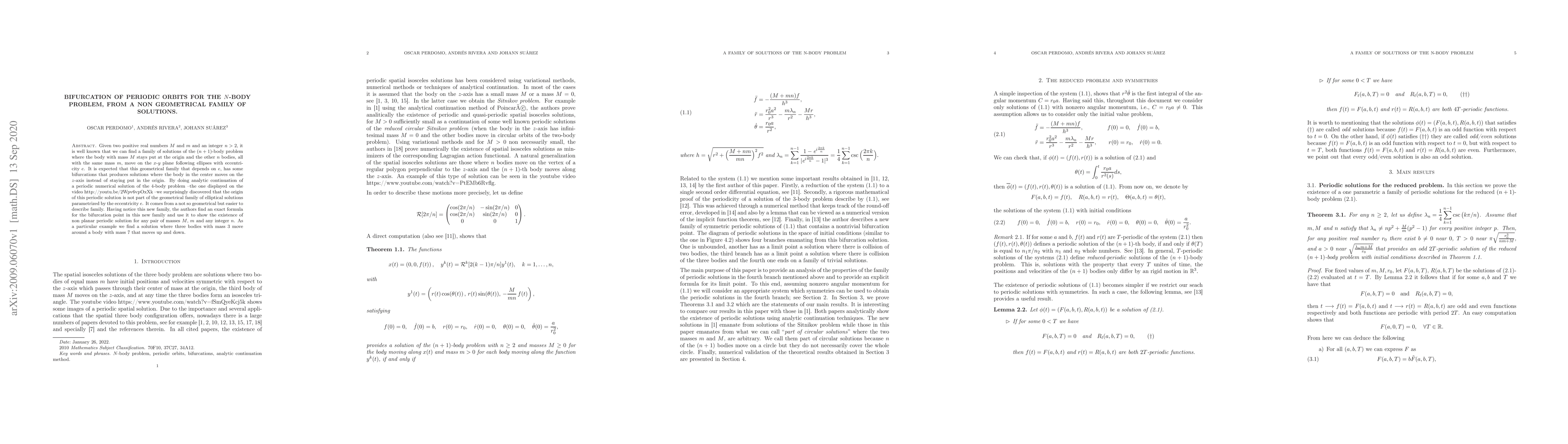 Given two positive real numbers $M$ and $m$ and an integer $n>2$, it is well known that we can find a family of solutions of the $(n+1)$-body problem where the body with mass $M$ stays put at the origin and the other $n$ bodies, all with the same mass $m$, move on the $x$-$y$ plane following ellipses with eccentri\-city $e$. It is expected that this geometrical family that depends on $e$, has some bifurcations that produce solutions where the body in the center moves on the $z$-axis instead of staying put in the origin. By doing an analytic continuation of a periodic numerical solution of the $4$-body problem --the one displayed on the video http://youtu.be/2Wpv6vpOxXk --we surprisingly discovered that the origin of this periodic solution is not part of the geometrical family of elliptical solutions parametrized by the eccentricity $e$. It comes from a not so geometrical but easier to describe family. Having noticed this new family, the authors find an exact formula for the bifurcation point in this new family and use it to show the existence of a non-planar periodic solution for any pair of masses $M$, $m$, and any integer $n$. As a particular example, we find a solution where three bodies with mass $3$ move around a body with mass $7$ that moves up and down.