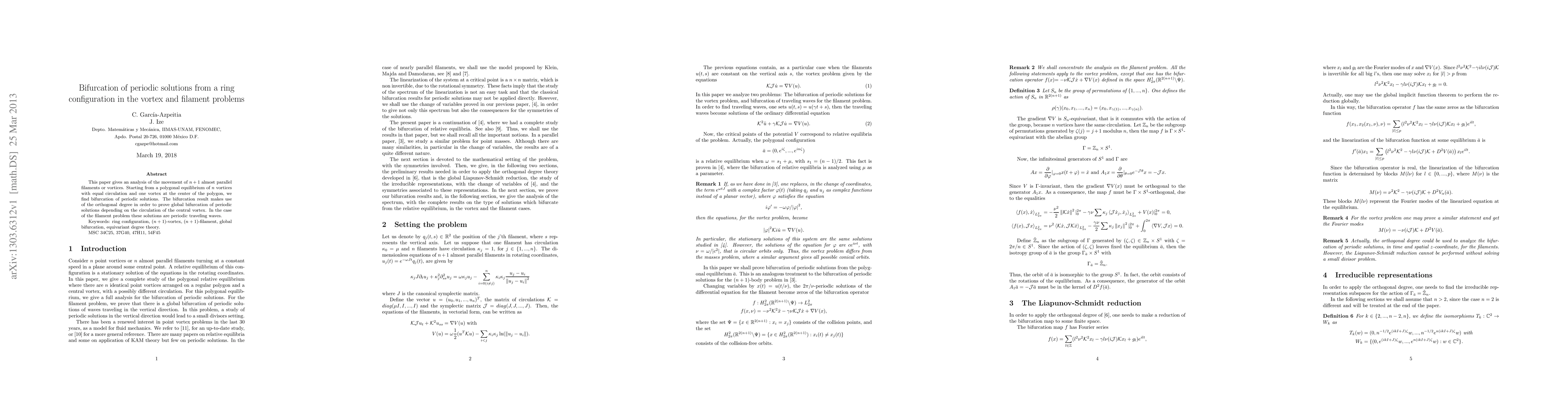 This paper analyzes the movement of n+1 almost parallel filaments or vortices, revealing the bifurcation of periodic solutions from a ring configuration using the orthogonal degree. It focuses on the global bifurcation of periodic traveling waves in the filament problem, depending on the circulation of the central vortex.