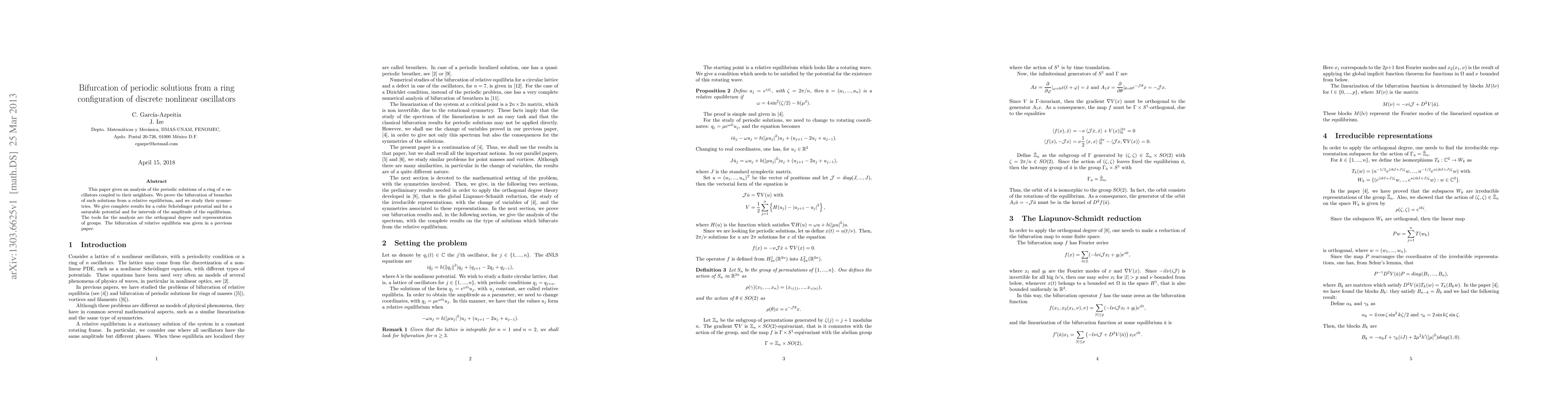 This paper analyzes periodic solutions in a ring of coupled nonlinear oscillators, proving the bifurcation of solution branches from relative equilibrium and studying their symmetries. Complete results are provided for cubic and saturable potentials using orthogonal degree and group representation methods.