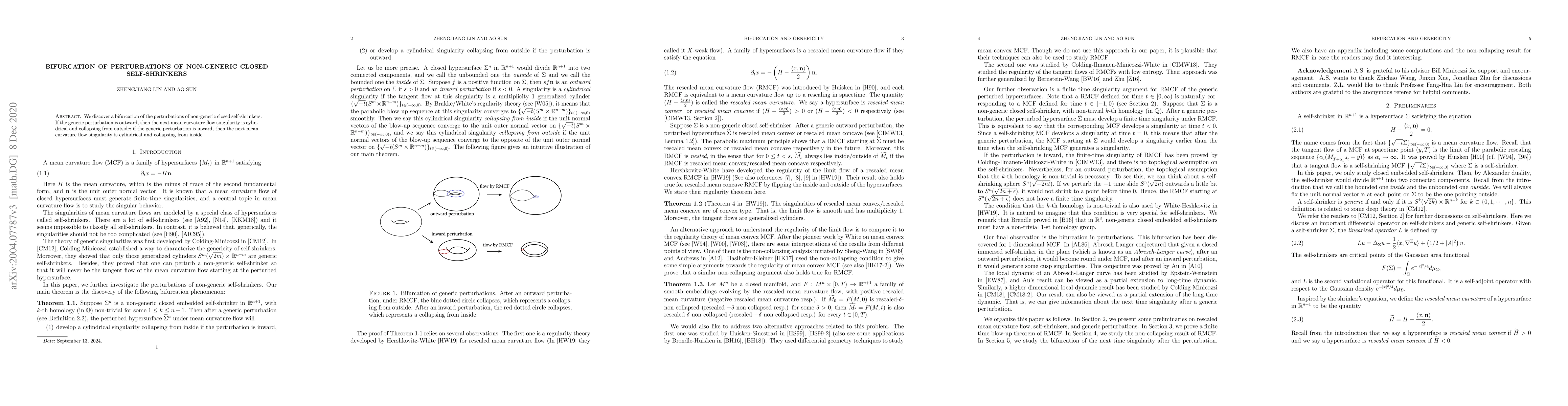 The research identifies a bifurcation in the behavior of perturbed, non-generic closed self-shrinkers. Depending on whether the generic perturbation is outward or inward, the next mean curvature flow singularity is described as either cylindrical and collapsing from the outside or cylindrical and collapsing from the inside.