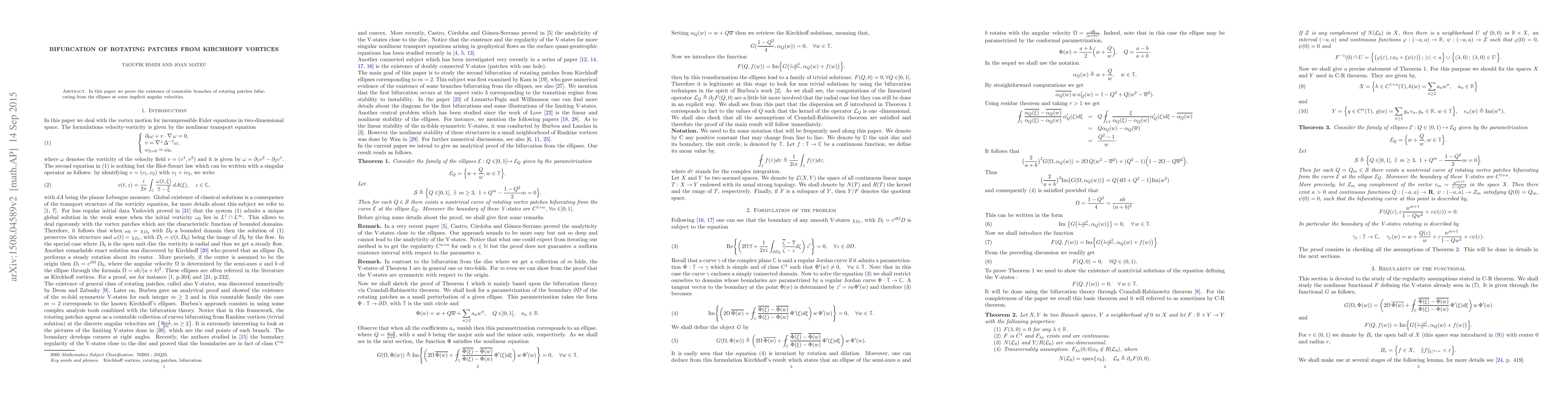 Summary: This paper demonstrates the emergence of multiple rotating patch solutions from elliptical Kirchhoff vortices at specific angular velocities, establishing a bifurcation phenomenon.