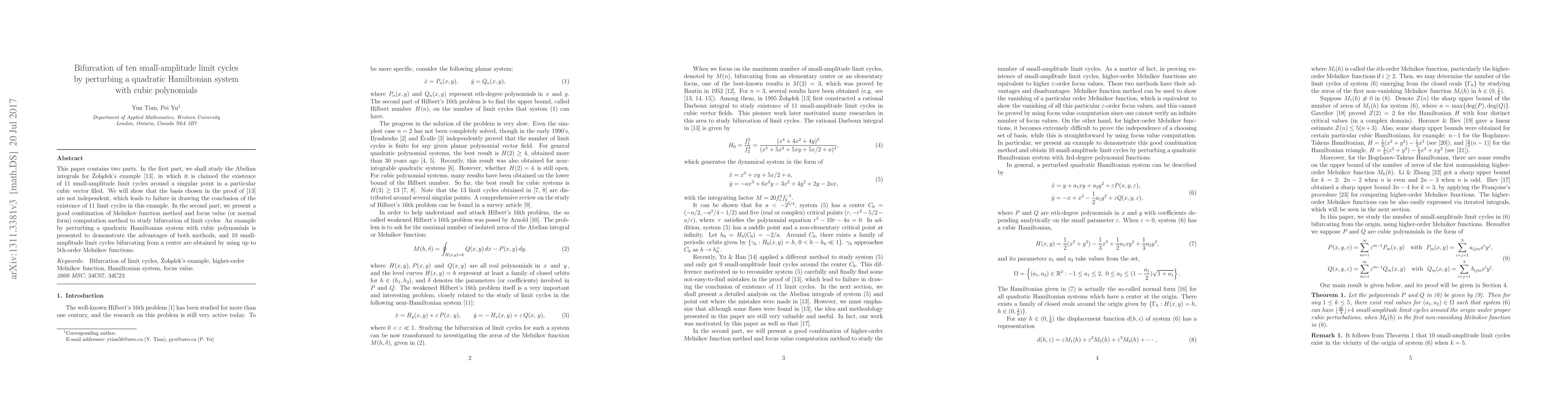 This paper corrects Zoladek's claim of 11 limit cycles in a cubic vector field, showing the basis used was not independent. It then uses Melnikov function and focus value methods to successfully demonstrate the bifurcation of 10 small-amplitude limit cycles from a perturbed quadratic Hamiltonian system.