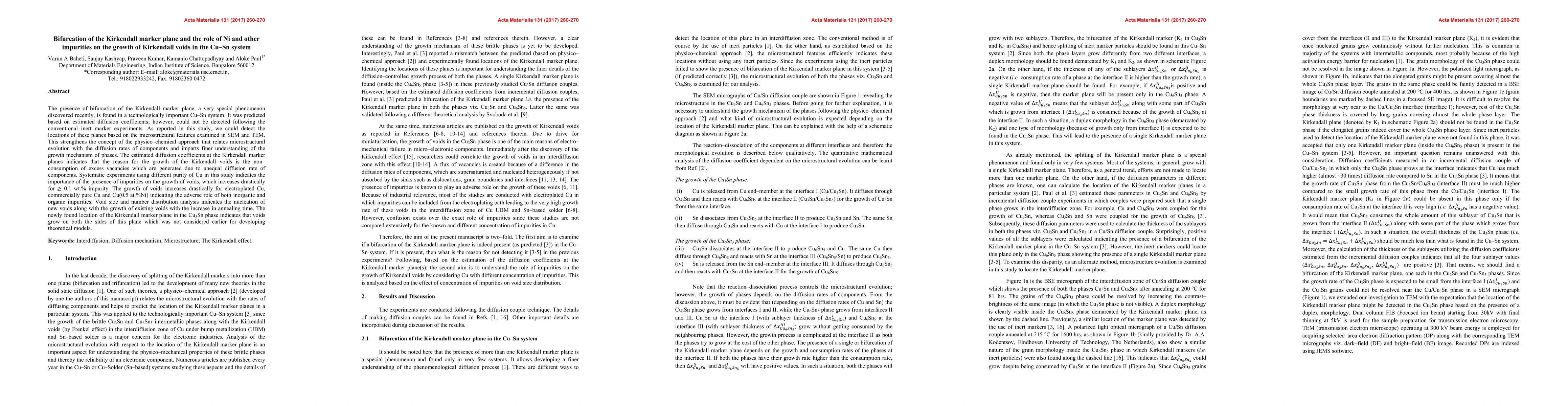 The presence of bifurcation of the Kirkendall marker plane, a very special phenomenon discovered recently, is found in a technologically important Cu Sn system. It was predicted based on estimated diffusion coefficients; however, could not be detected following the conventional inert marker experiments. As reported in this study, we could detect the locations of these planes based on the microstructural features examined in SEM and TEM. This strengthens the concept of the physicochemical approach that relates microstructural evolution with the diffusion rates of components and imparts finer understanding of the growth mechanism of phases. The estimated diffusion coefficients at the Kirkendall marker planes indicates that the reason for the growth of the Kirkendall voids is the nonconsumption of excess vacancies which are generated due to unequal diffusion rate of components. Systematic experiments using different purity of Cu in this study indicates the importance of the presence of impurities on the growth of voids, which increases drastically for greather than 0.1 wt percent impurity. The growth of voids increases drastically for electroplated Cu, commercially pure Cu and Cu(0.5 at percent Ni) indicating the adverse role of both inorganic and organic impurities. Void size and number distribution analysis indicates the nucleation of new voids along with the growth of existing voids with the increase in annealing time. The newly found location of the Kirkendall marker plane in the Cu3Sn phase indicates that voids grow on both the sides of this plane which was not considered earlier for developing theoretical models.
