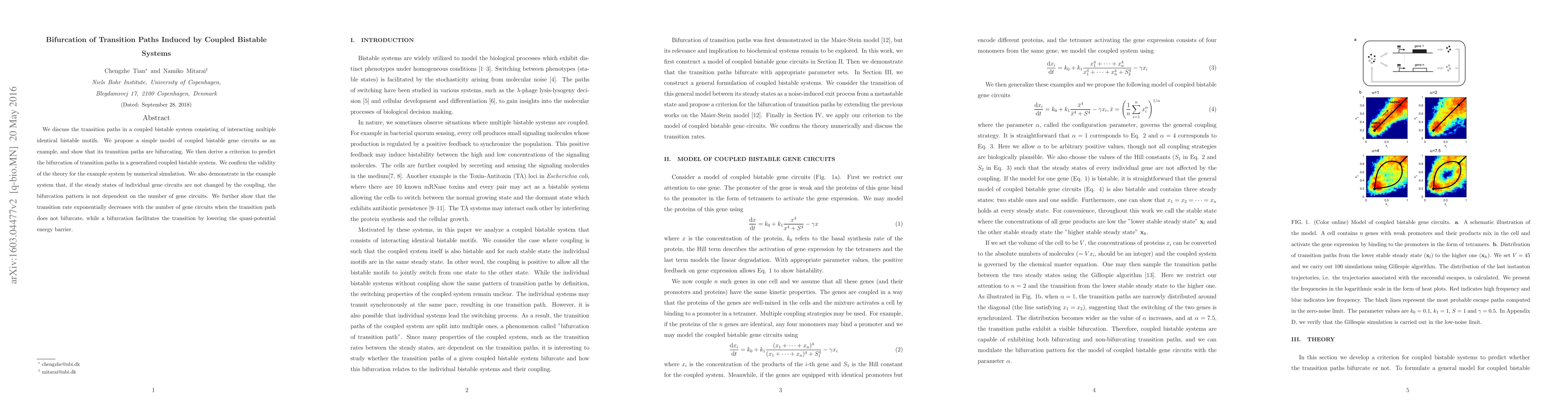 We discuss the transition paths in a coupled bistable system consisting of interacting multiple identical bistable motifs. We propose a simple model of coupled bistable gene circuits as an example, and show that its transition paths are bifurcating. We then derive a criterion to predict the bifurcation of transition paths in a generalized coupled bistable system. We confirm the validity of the theory for the example system by numerical simulation. We also demonstrate in the example system that, if the steady states of individual gene circuits are not changed by the coupling, the bifurcation pattern is not dependent on the number of gene circuits. We further show that the transition rate exponentially decreases with the number of gene circuits when the transition path does not bifurcate, while a bifurcation facilitates the transition by lowering the quasi-potential energy barrier.