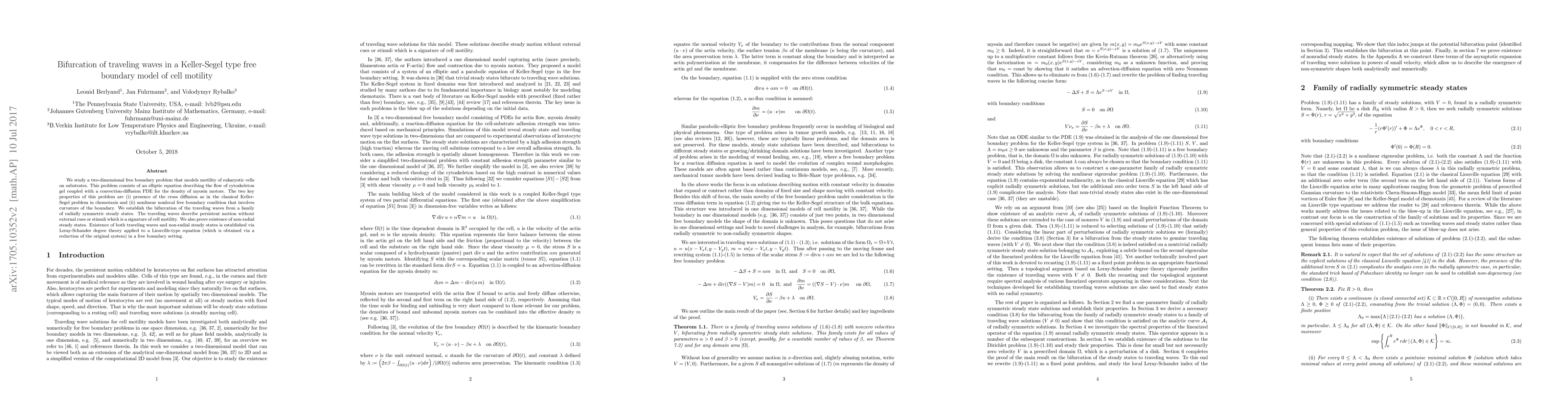 We study a two-dimensional free boundary problem that models motility of eukaryotic cells on substrates. This problem consists of an elliptic equation describing the flow of cytoskeleton gel coupled with a convection-diffusion PDE for the density of myosin motors. The two key properties of this problem are (i) presence of the cross diffusion as in the classical Keller-Segel problem in chemotaxis and (ii) nonlinear nonlocal free boundary condition that involves curvature of the boundary. We establish the bifurcation of the traveling waves from a family of radially symmetric steady states. The traveling waves describe persistent motion without external cues or stimuli which is a signature of cell motility. We also prove existence of non-radial steady states. Existence of both traveling waves and non-radial steady states is established via Leray-Schauder degree theory applied to a Liouville-type equation (which is obtained via a reduction of the original system) in a free boundary setting.