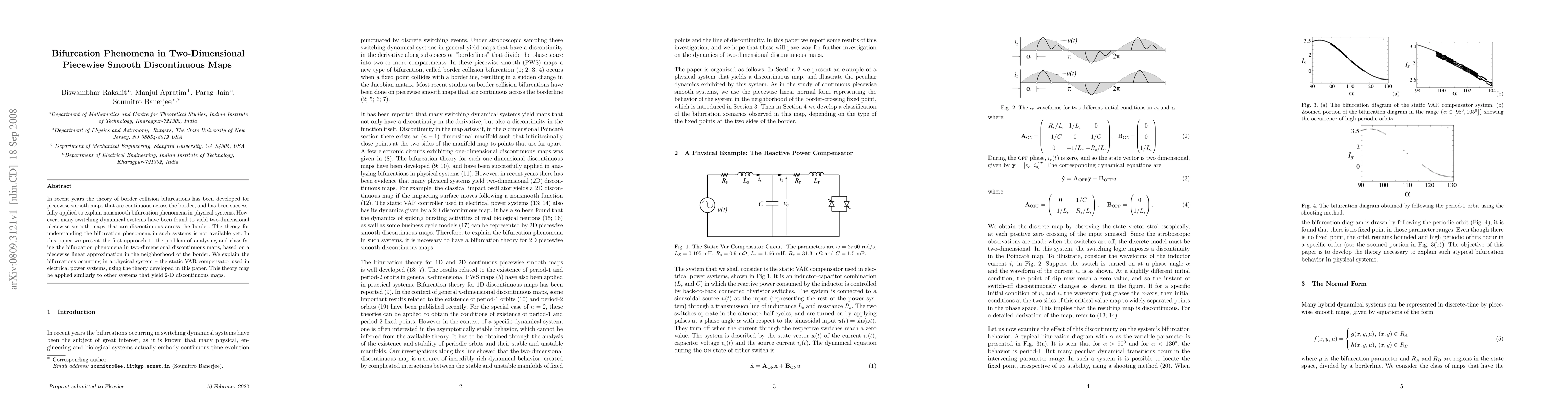 This paper introduces a novel approach to analyze and classify bifurcation phenomena in two-dimensional piecewise smooth discontinuous maps, using piecewise linear approximations near borders. The developed theory is exemplified by explaining bifurcations in a static VAR compensator in electrical power systems, and it can be extended to other similar systems.