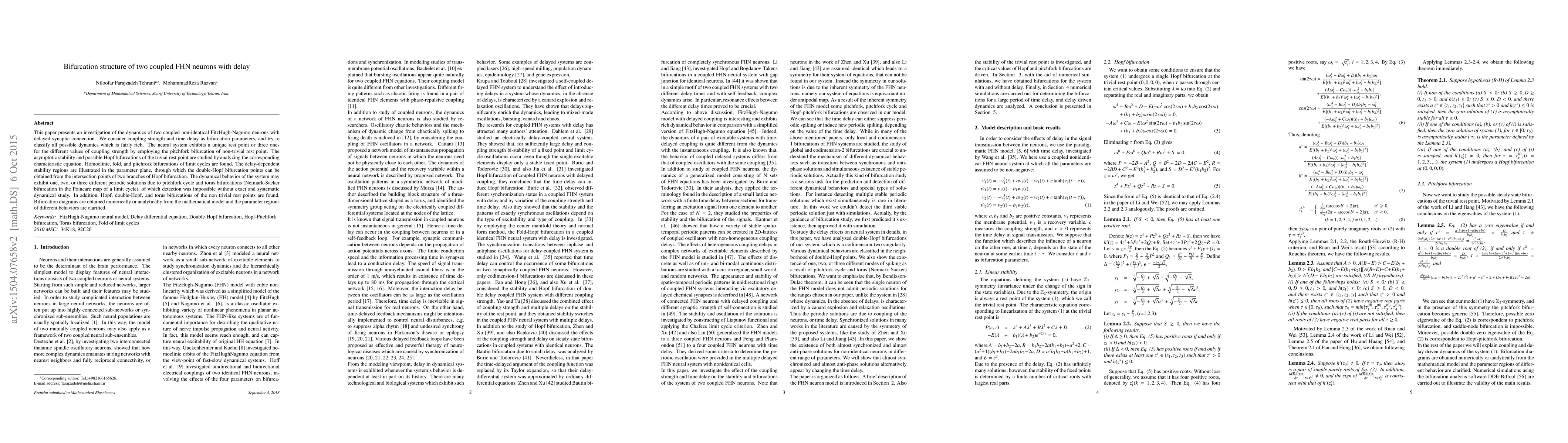 This paper investigates the dynamics of two coupled non-identical FitzHugh-Nagumo neurons with delayed synaptic connections, classifying various bifurcations and stability regions. The study reveals complex behaviors including pitchfork, Hopf, and double-Hopf bifurcations, and identifies parameter regions for different periodic solutions.
